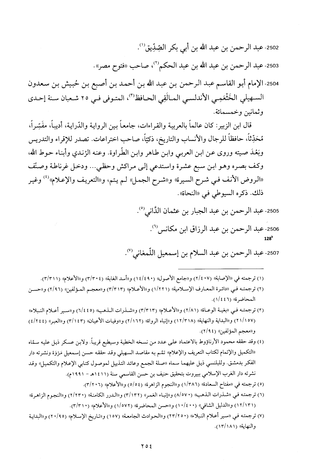 2504 - الإمام أبو القاسم عبد الرحمن بن عبد الله بن أحمد بن أصبع بن حُبيش بن سعدون السهيلي الخَثْعَمِي الأندلسي المالَقِي الحافظ (¬3)، المتوفى في 25 شعبان سنة إحدى وثمانين وخمسمائة.