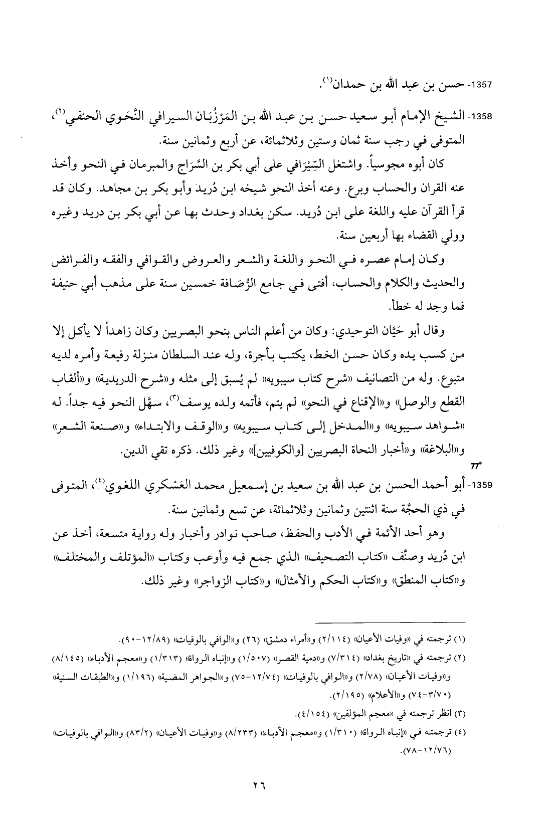 1358 - الشيخ الإمام أبو سعيد حسن بن عبد الله بن المَرْزُبَان السيرافي النَّحَوي الحنفي (¬2)، المتوفى في رجب سنة ثمان وستين وثلاثمائة، عن أربع وثمانين سنة.