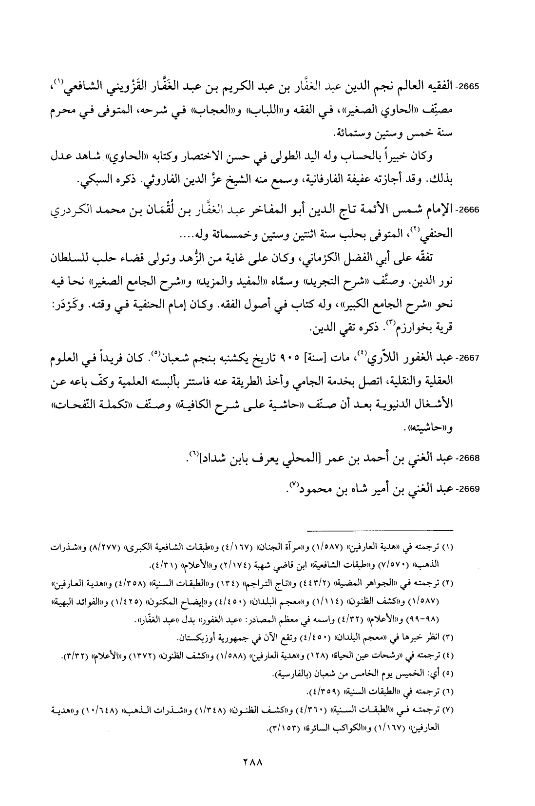 2665 - الفقيه العالم نجم الدين عبد الغفَّار بن عبد الكريم بن عبد الغَفَّار القَزْويني الشافعي (¬1)، مصنِّف "الحاوي الصغير"، في الفقه و"اللباب" و"العجاب" في شرحه، المتوفى في محرم سنة خمس وستين وستمائة.