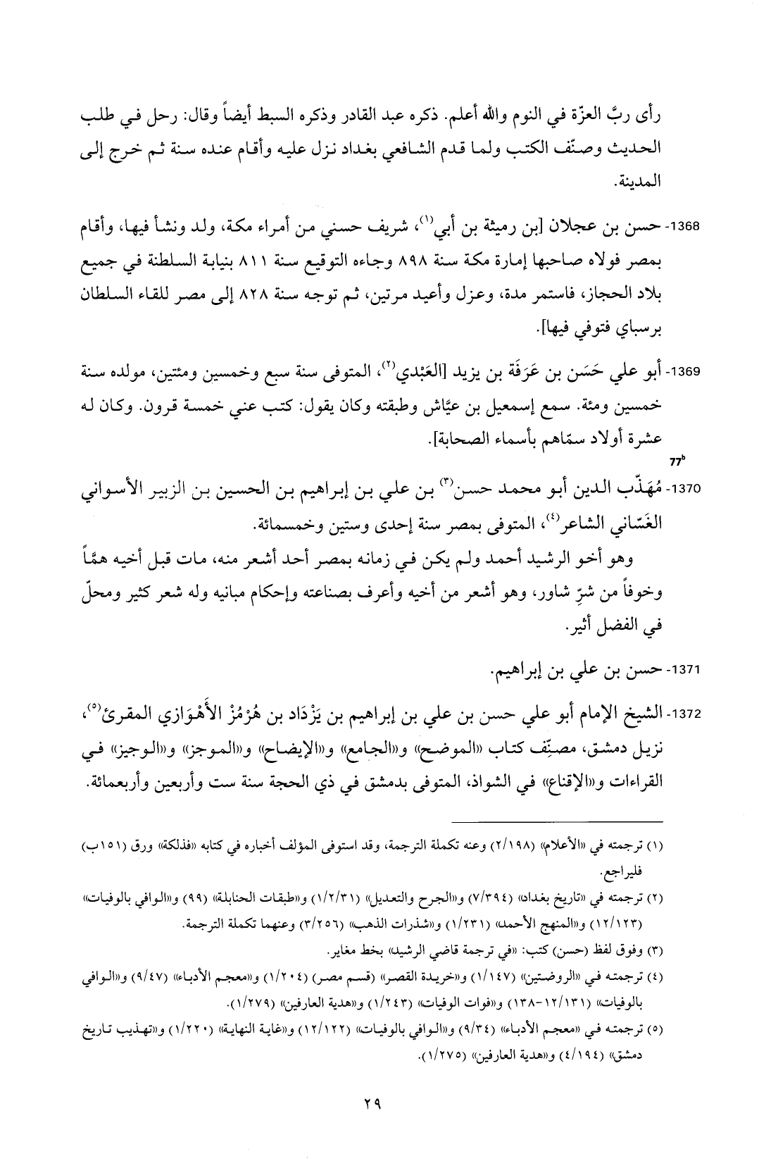 1372 - الشيخ الإمام أبو علي حسن بن علي بن إبراهيم بن يَزْدَاد بن هرمُزْ الأَهْوَازي المقرئ (¬5)، نزيل دمشق، مصنِّف كتاب "الموضح" و"الجامع" و"الإيضاح" و"الموجز" و"الوجيز" في القراءات و"الإقناع" في الشواذ، المتوفى بدمشق في ذي الحجة سنة ست وأربعين وأربعمائة.