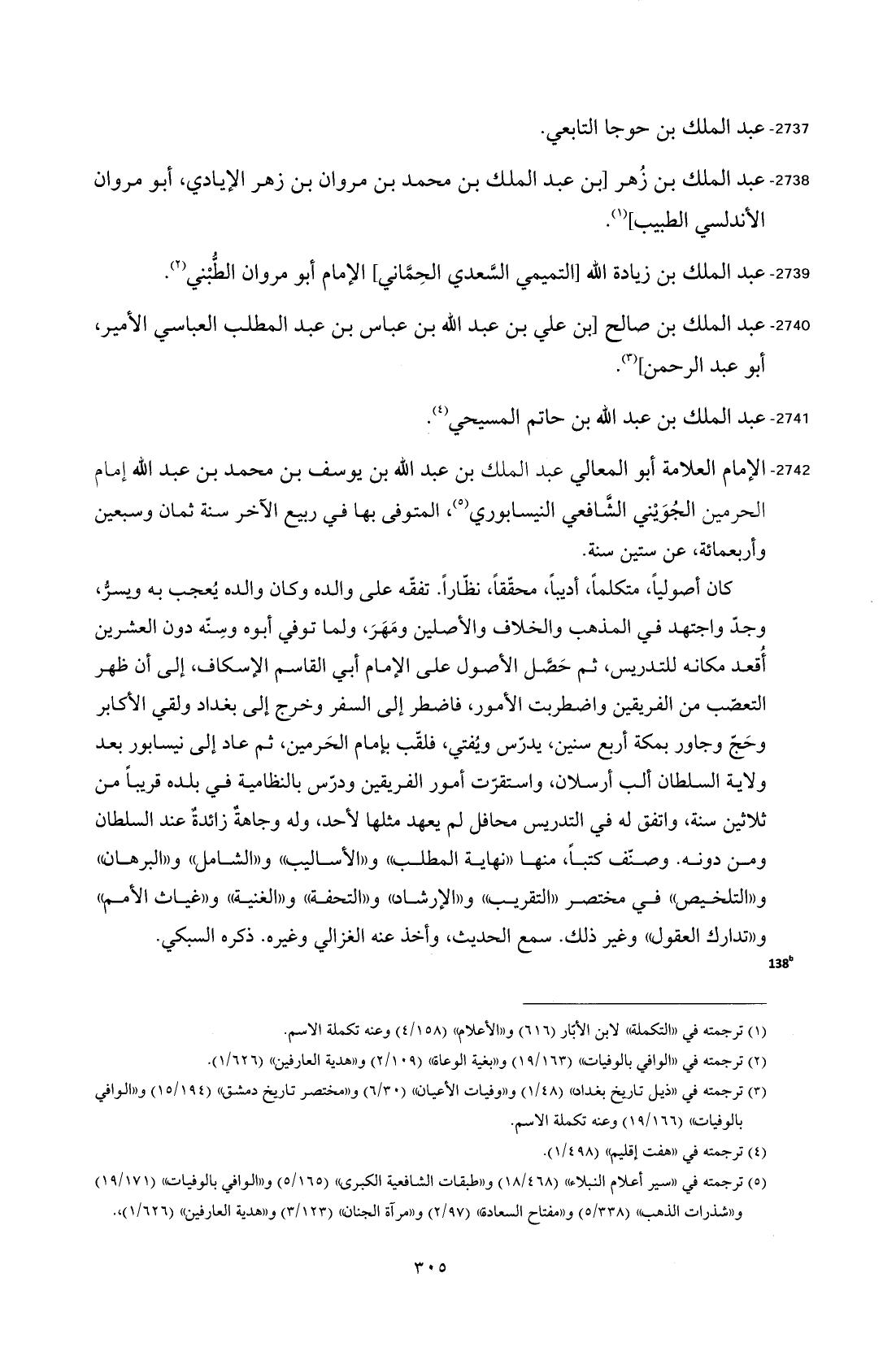 2742 - الإمام العلامة أبو المعالي عبد الملك بن عبد الله بن يوسف بن محمد بن عبد الله إمام الحرمين الجُوَيْني الشَّافعي النيسابوري (¬5)، المتوفى بها في ربيع الآخر سنة ثمان وسبعين وأربعمائة، عن ستين سنة.