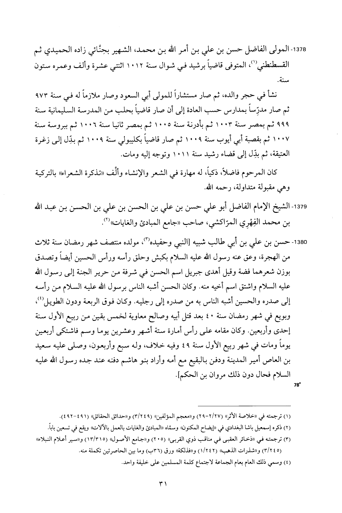 1378 - المولى الفاضل حسن بن علي بن أمر الله بن محمد، الشهير بحِنَّائي زاده الحميدي ثم القسطنطني (¬1)، المتوفى قاضياً برشيد في شوال سنة 1012 اثنتي عشرة وألف وعمره ستون سنة.
