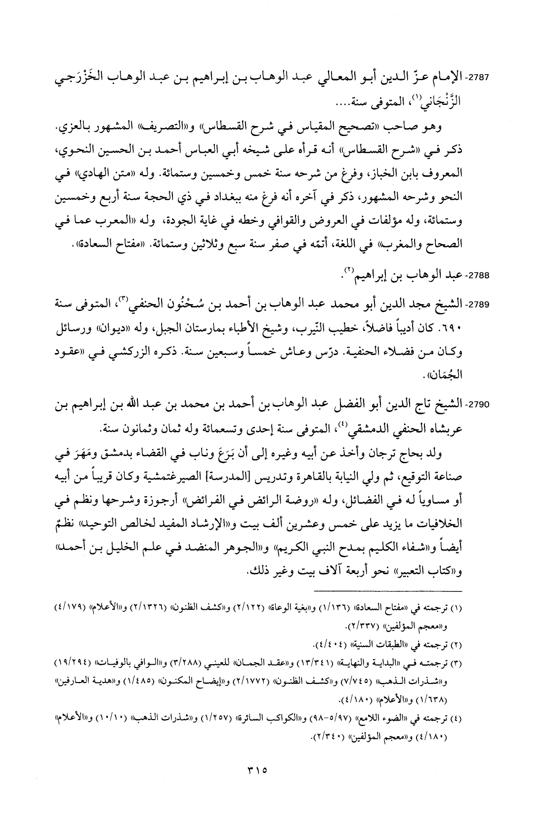2789 - الشيخ مجد الدين أبو محمد عبد الوهاب بن أحمد بن سُحْنُون الحنفي (¬3)، المتوفى سنة 690. كان أديبًا فاضلًا، خطيب النّيرب، وشيخ الأطباء بمارستان الجبل، وله "ديوان" ورسائل وكان من فضلاء الحنفية. درّس وعاش خمسًا وسبعين سنة. ذكره الزركشي في "عقود الجُمَان".