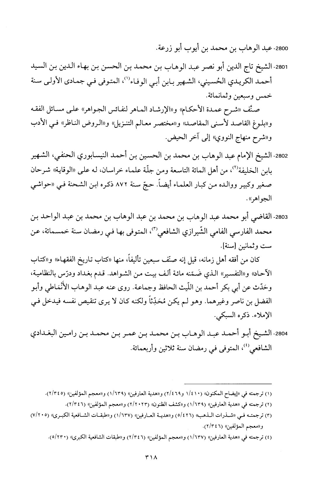 2802 - الشيخ الإمام عبد الوهاب بن محمد بن الحسين بن أحمد النيسابوري الحنفي، الشهير بابن الخليفة (¬2)، من أهل المائة التاسعة ومن جلّة علماء خراسان، له على"الوقاية" شرحان صغير وكبير ووالده من كبار العلماء أيضًا. حجّ سنة 872 ذكره ابن الشحنة في "حواشي الجواهر".