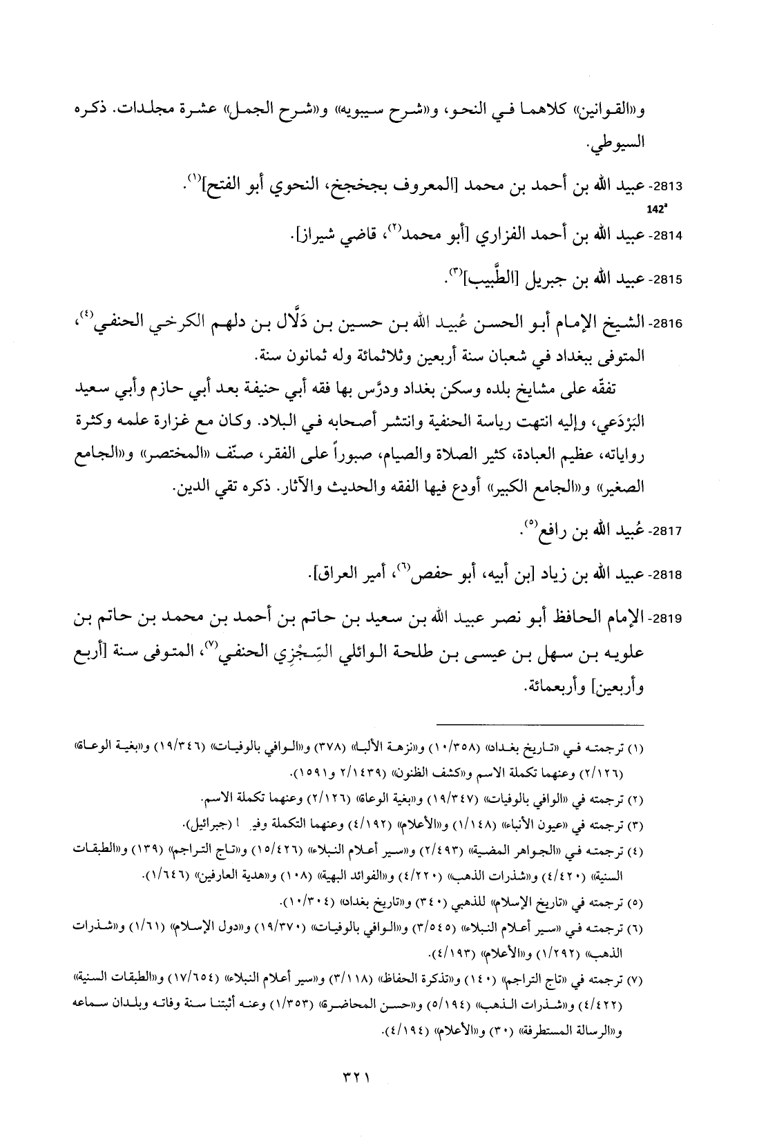 2819 - الإمام الحافظ أبو نصر عبيد الله بن سعيد بن حاتم بن أحمد بن محمد بن حاتم بن علويه بن سهل بن عيسى بن طلحة الوائلي السِّجْزِي الحنفي (¬7)، المتوفى سنة [أربع وأربعين] وأربعمائة.