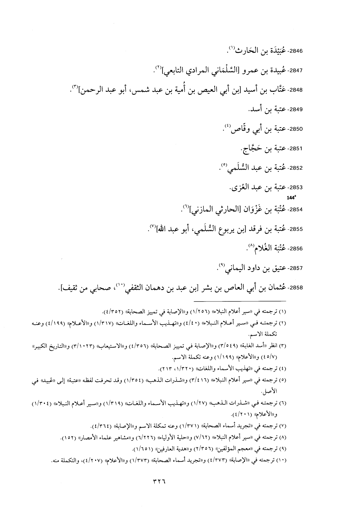 (¬5) ترجمته في "سير أعلام النبلاء" (3/ 416) و"شذرات الذهب" (1/ 354) وقد تحرفت لفظه "عتبة" إلى"عبيد" في الأصل.