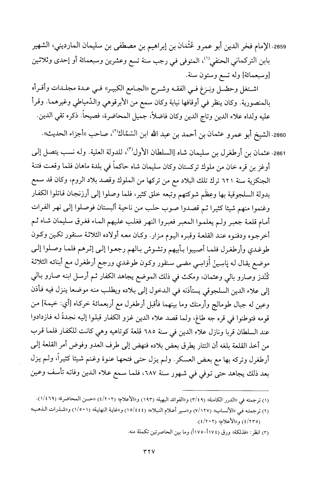 2859 - الإمام فخر الدين أبو عمرو عُثْمَان بن إبراهيم بن مصطفى بن سليمان المارديني، الشهير بابن التركماني الحنفي (¬1)، المتوفى في رجب سنة تسع وعشرين وسبعمائة أو إحدى وثلاثين [وسبعمائة] وله تسع وستون سنة.