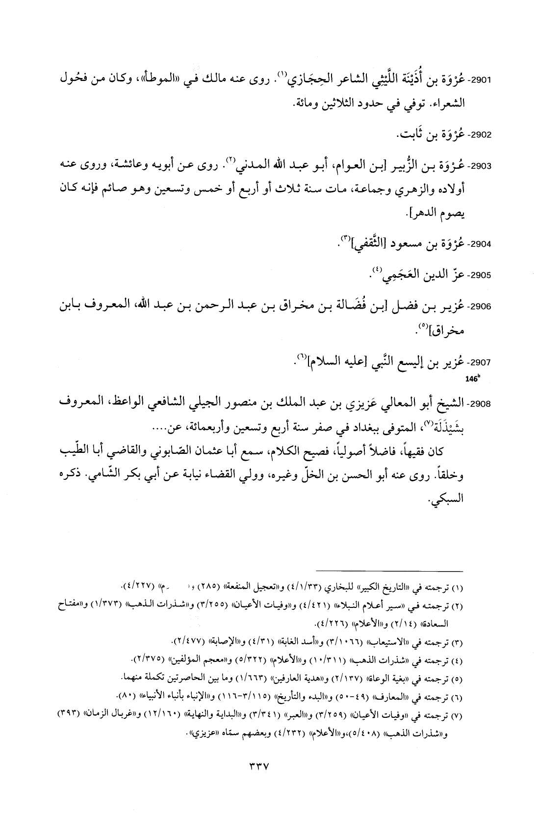 2901 - عُرْوَة بن أُذَيْنَة اللَّيْثِي الشاعر الحِجَازي (¬1). روى عنه مالك في "الموطأ"، وكان من فحُول الشعراء. توفي في حدود الثلاثين ومائة.