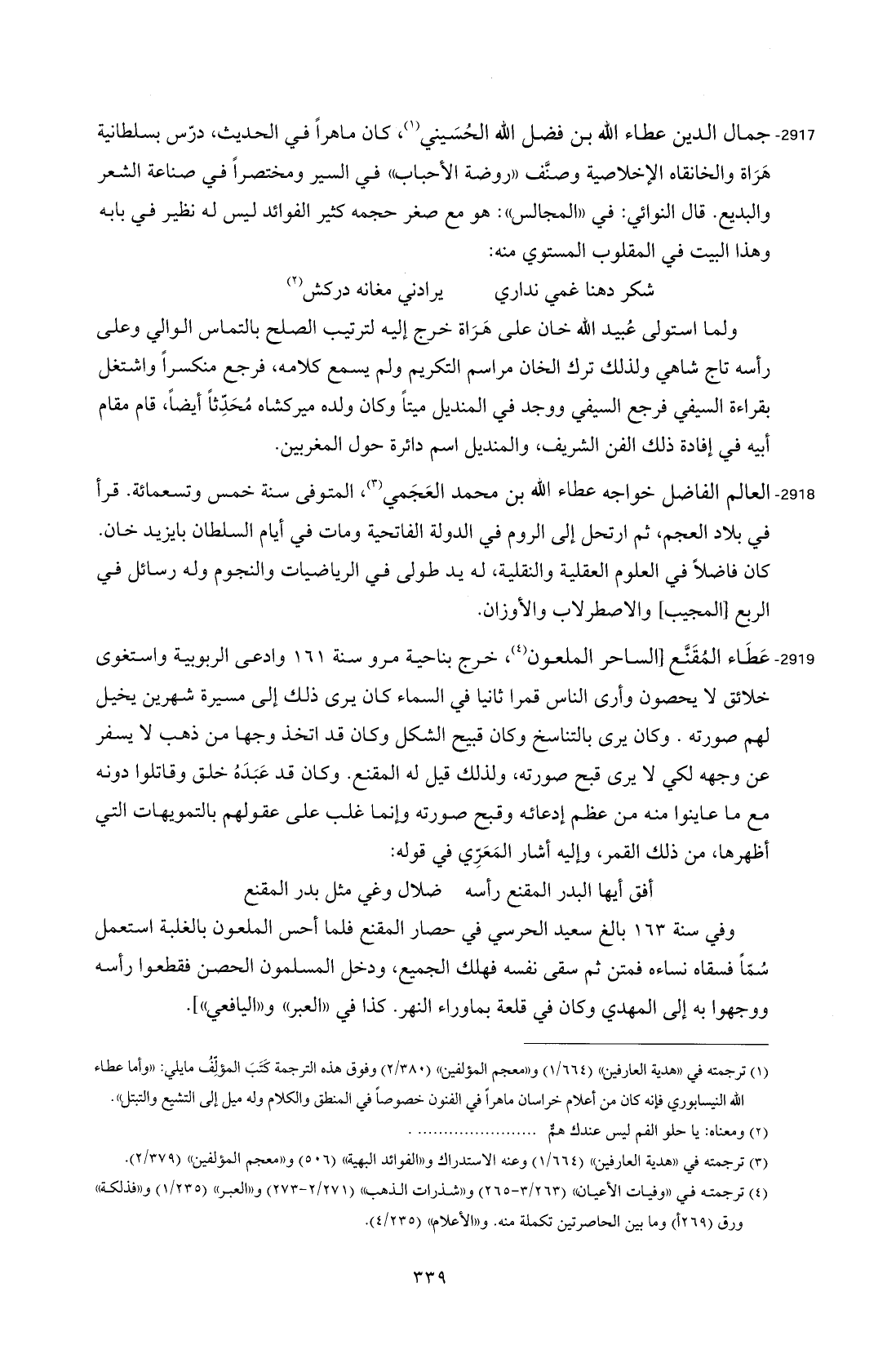 2918 - العالم الفاضل خواجه عطاء الله بن محمد العَجَمي (¬3)، المتوفى سنة خمس وتسعمائة. قرأ في بلاد العجم، ثم ارتحل إلى الروم في الدولة الفاتحية ومات في أيام السلطان بايزيد خان. كان فاضلًا في العلوم العقلية والنقلية، له يد طولى في الرياضيات والنجوم وله رسائل في الربع [المجيب] والاصطرلاب والأوزان.