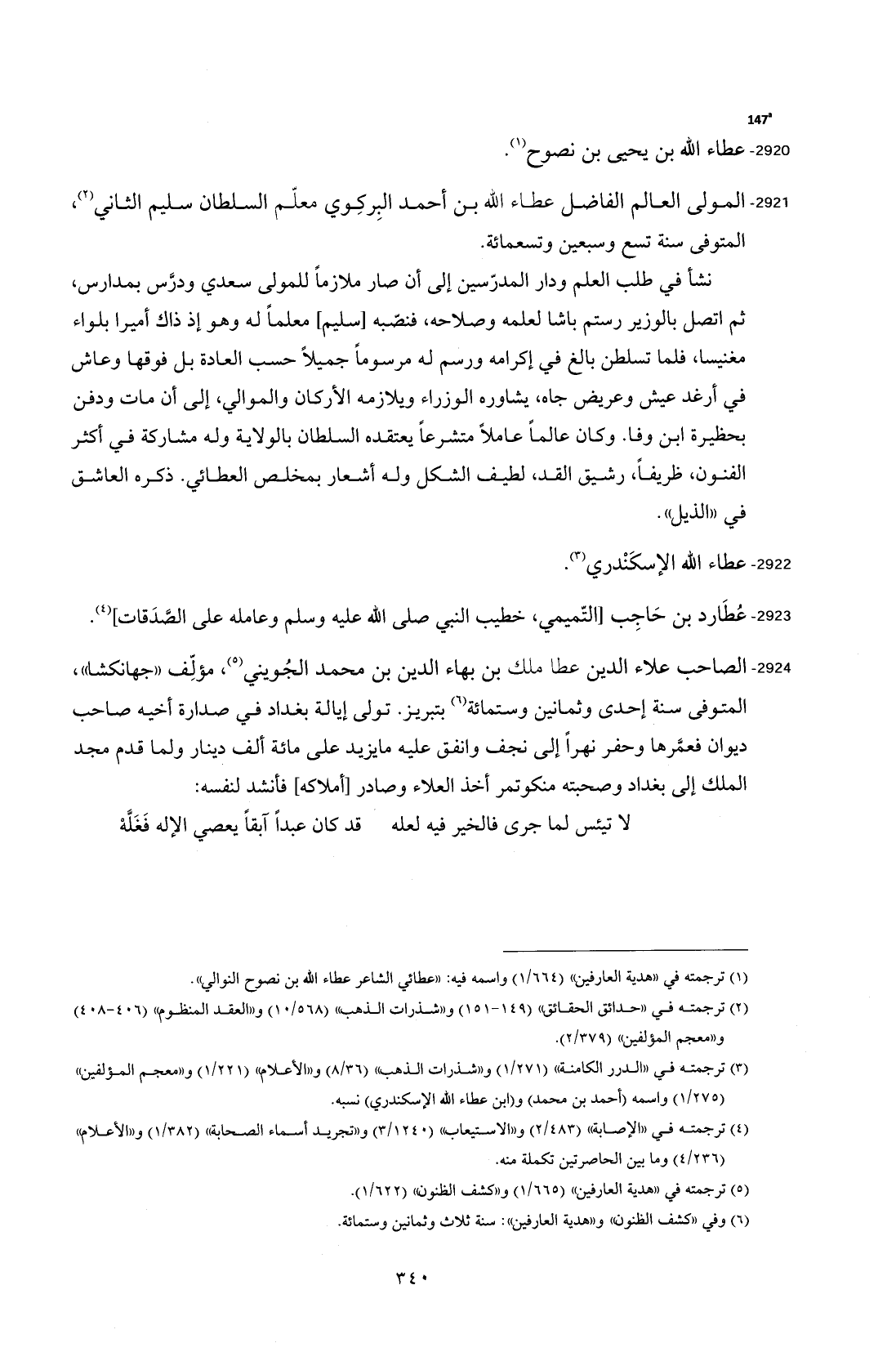 2921 - المولى العالم الفاضل عطاء الله بن أحمد البِركِوي معلّم السلطان سليم الثاني (¬2)، المتوفى سنة تسع وسبعين وتسعمائة.