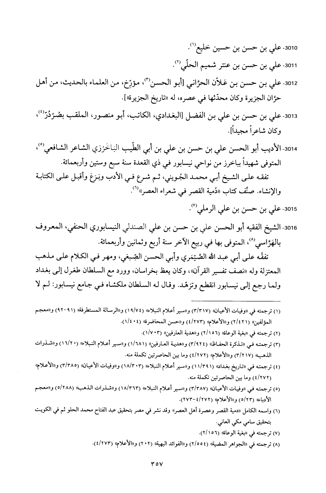 3014 - الأديب أبو الحسن علي بن حسن بن علي بن أبي الطّيب البَاخَرْزي الشاعر الشافعي (¬5)، المتوفى شهيدًا بباخرز من نواحي نيسابور في ذي القعدة سنة سبع وستين وأربعمائة.