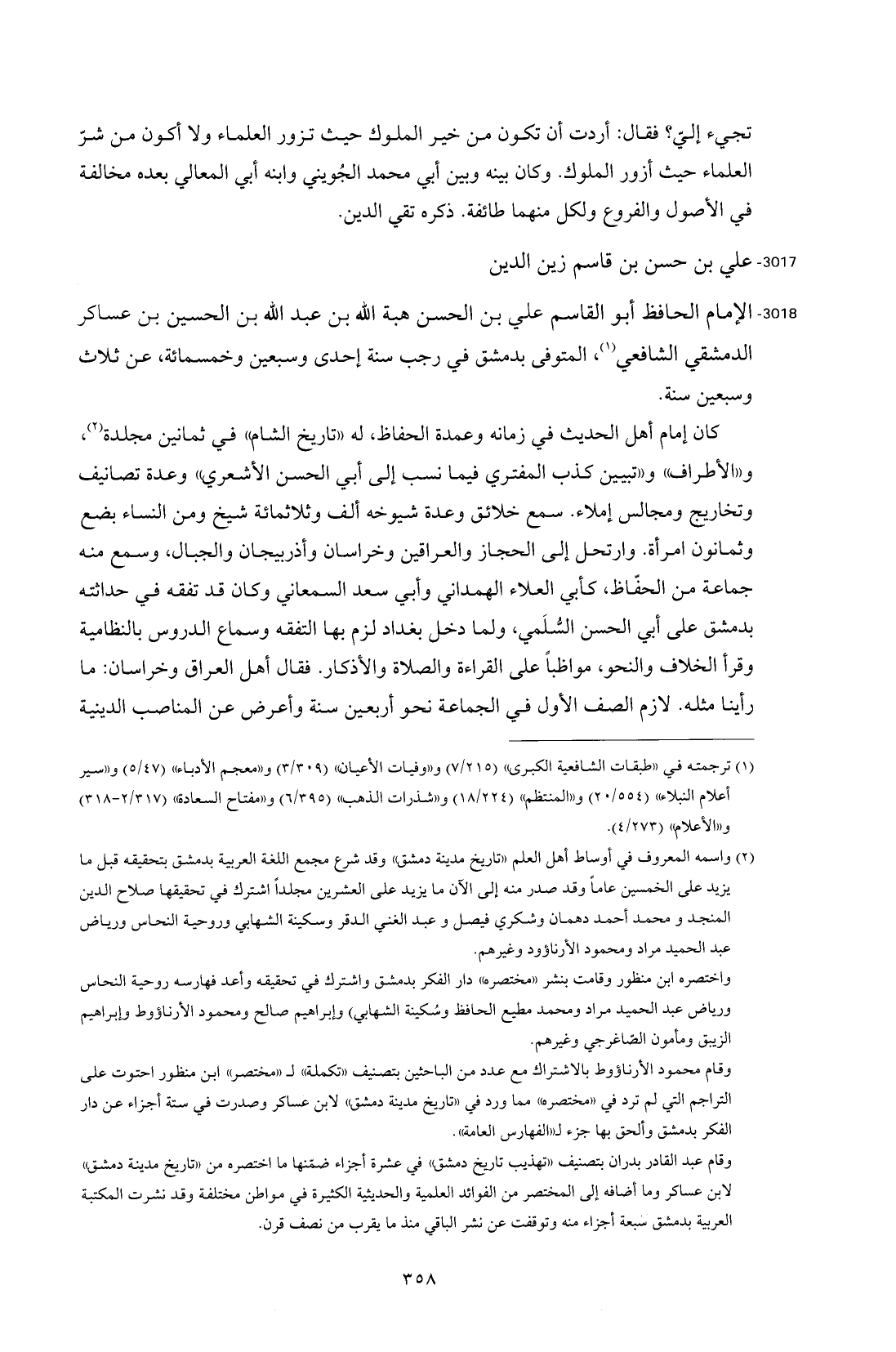(¬2) واسمه المعروف في أوساط أهل العلم "تاريخ مدينة دمشق" وقد شرع مجمع اللغة العربية بدمشق بتحقيقه قبل ما يزيد على الخمسين عاماً وقد صدر منه إلى الآن ما يزيد على العشرين مجلداً اشترك في تحقيقها صلاح الدين المنجد ومحمد أحمد دهمان وشكري فيصل وعبد الغني الدقر وسكينة الشهابي وروحية النحاس ورياض عبد الحميد مراد ومحمود الأرناؤود وغيرهم.