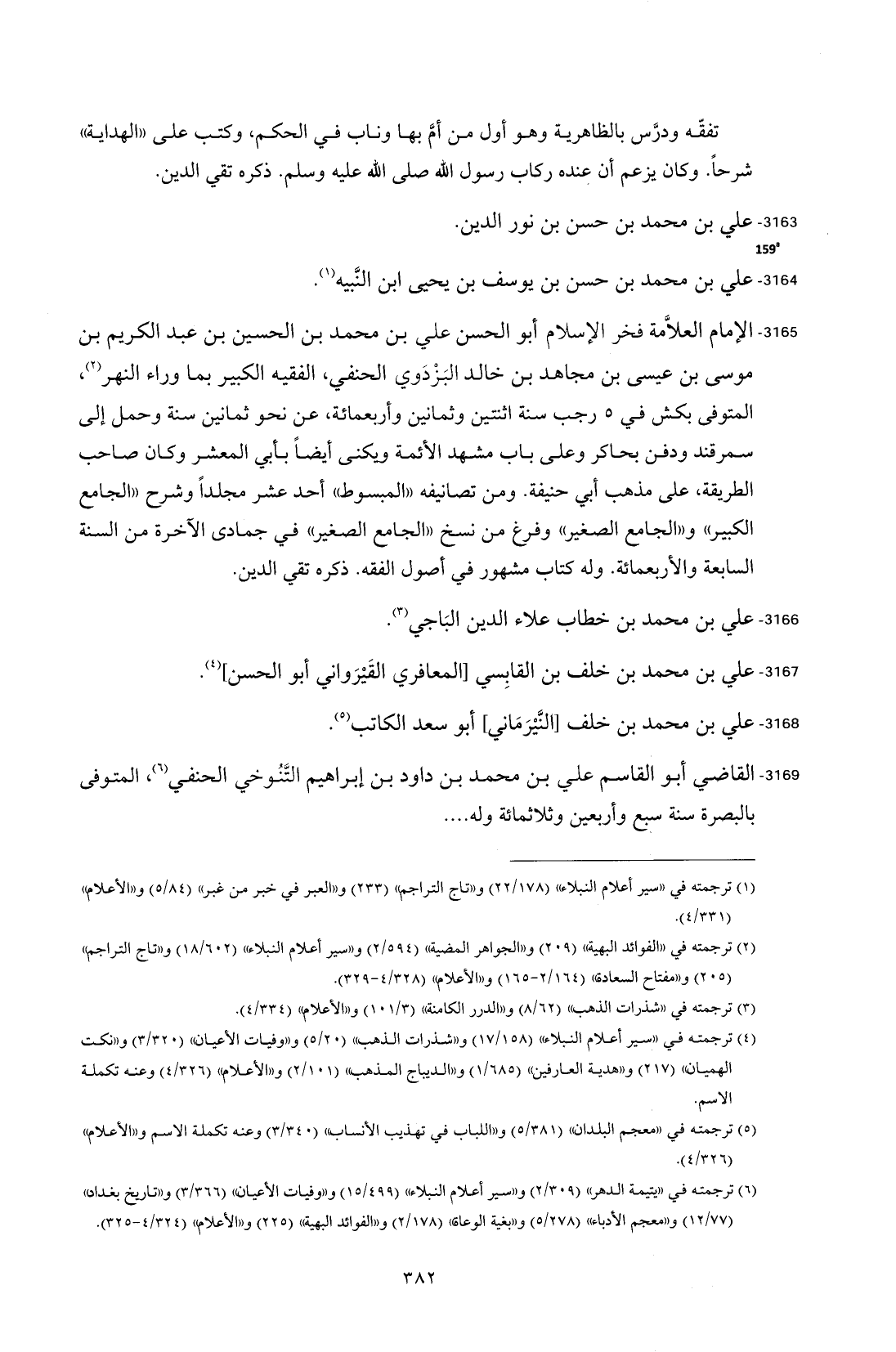 3165 - الإمام العلاَّمة فخر الإسلام أبو الحسن علي بن محمد بن الحسين بن عبد الكريم بن موسى بن عيسى بن مجاهد بن خالد البَزْدَوي الحنفي، الفقيه الكبير بما وراء النهر (¬2)، المتوفى بكش في 5 رجب سنة اثنتين وثمانين وأربعمائة، عن نحو ثمانين سنة وحمل إلى سمرقند ودفن بحاكر وعلى باب مشهد الأئمة ويكنى أيضاً بأبي المعشر وكان صاحب الطريقة، على مذهب أبي حنيفة. ومن تصانيفه "المبسوط" أحد عشر مجلداً وشرح "الجامع الكبير" و"الجامع الصَّغير" وفرغ من نسخ "الجامع الصَّغير" في جمادى الآخرة من السنة السابعة والأربعمائة. وله كتاب مشهور في أصول الفقه. ذكره تقي الدين.