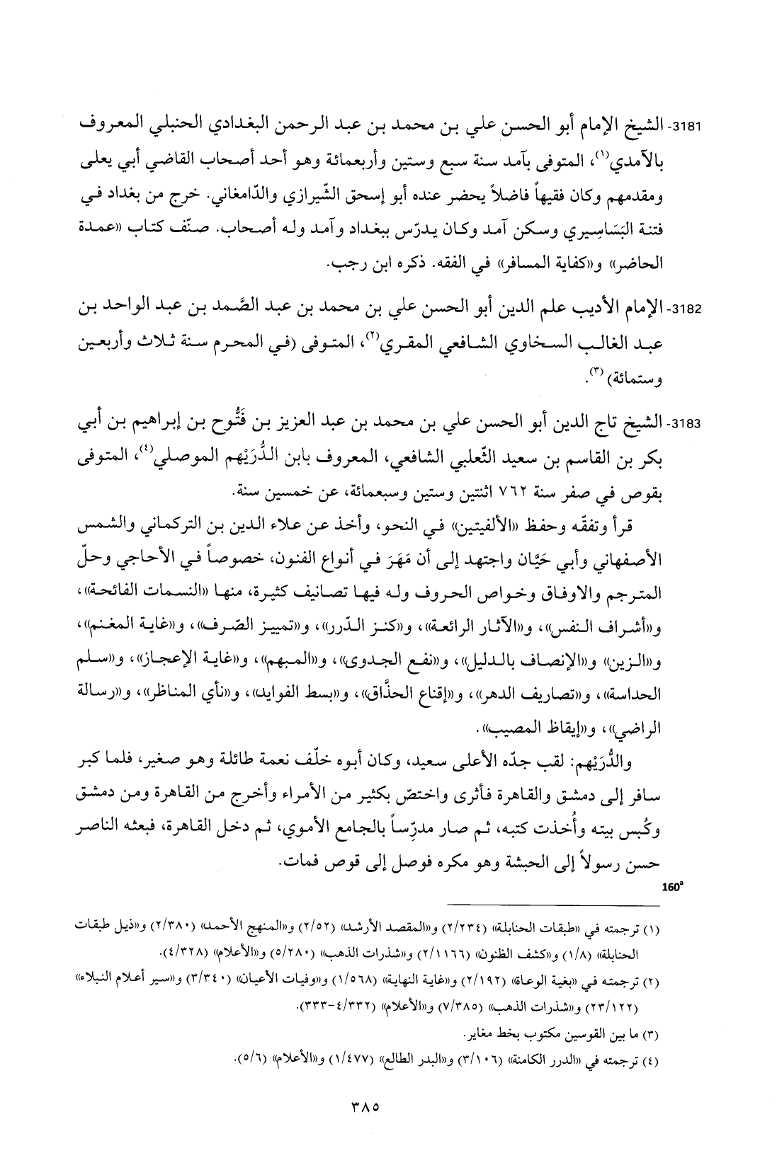 3181 - الشيخ الإمام أبو الحسن علي بن محمد بن عبد الرحمن البغدادي الحنبلي المعروف بالآمدي (¬1)، المتوفى بآمد سنة سبع وستين وأربعمائة وهو أحد أصحاب القاضي أبي يعلى ومقدمهم وكان فقيهاً فاضلاً يحضر عنده أبو إسحق الشّيرازي والدّامغاني. خرج من بغداد في فتنة البَسَاسِيري وسكن آمد وكان يدرّس ببغداد وآمد وله أصحاب. صنّف كتاب "عمدة الحاضر" و"كفاية المسافر" في الفقه. ذكره ابن رجب.