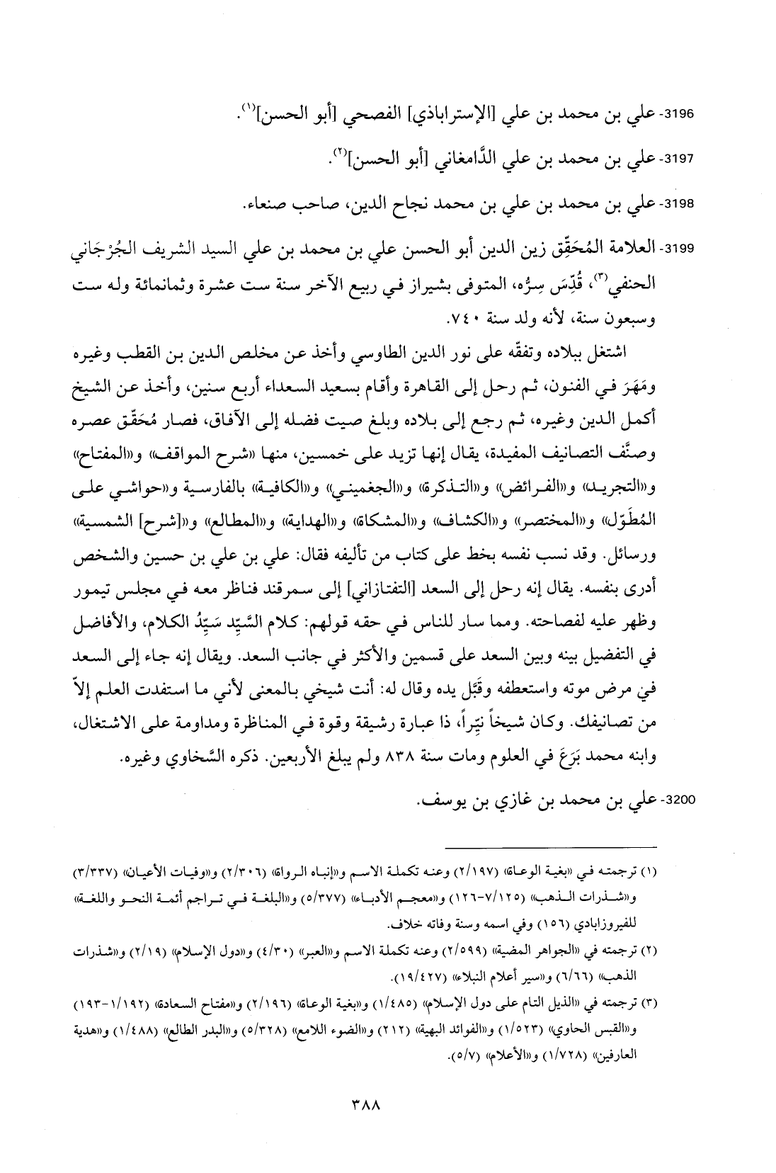 3199 - العلامة المُحَقِّق زين الدين أبو الحسن علي بن محمد بن علي السيد الشريف الجُرْجَاني الحنفي (¬3)، قُذِسَ سِرُّه، المتوفى بشيراز في ربيع الآخر سنة ست عشرة وثمانمائة وله ست وسبعون سنة؛ لأنه ولد سنة 740.