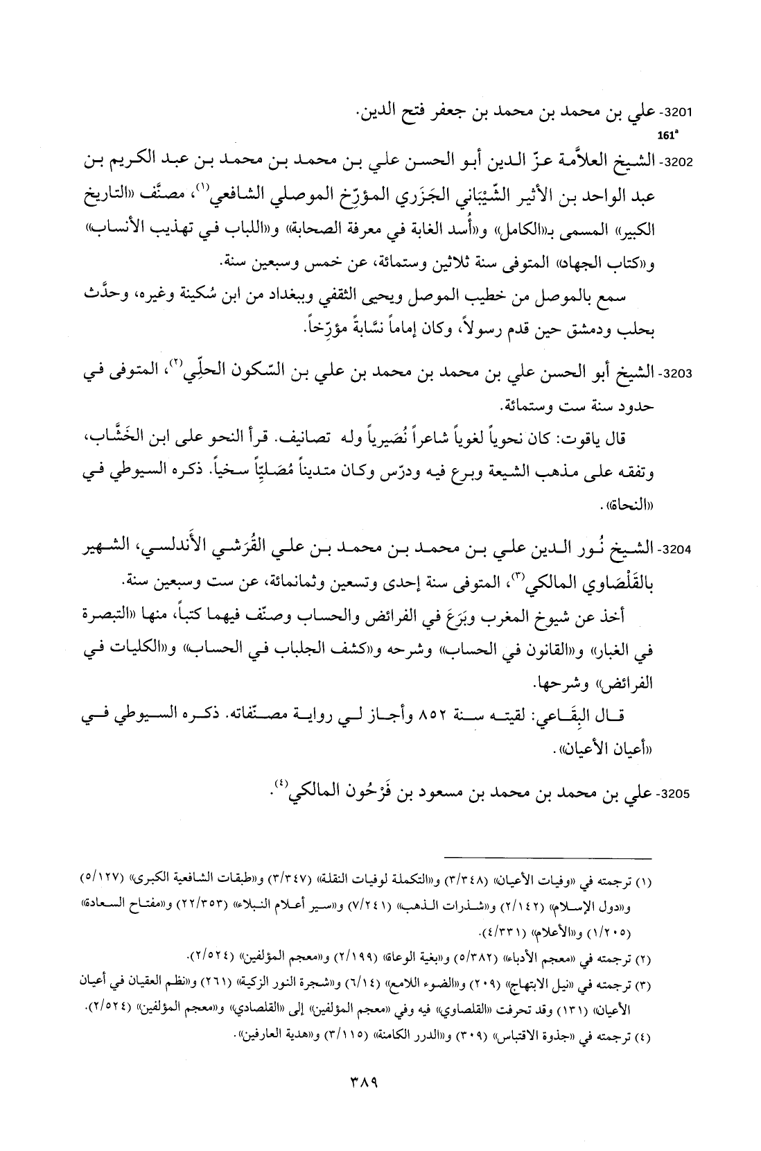 3202 - الشيخ العلاَّمة عزّ الدين أبو الحسن علي بن محمد بن محمد بن عبد الكريم بن عبد الواحد بن الأثير الشّيْبَاني الجَزَري المؤرِّخ الموصلي الشافعي (¬1)، مصنَّف "التاريخ الكبير" المسمى بـ "الكامل" و"أُسد الغابة في معرفة الصّحابة" و"اللباب في تهذيب الأنساب" و"كتاب الجهاد" المتوفى سنة ثلاثين وستمائة، عن خمس وسبعين سنة.
