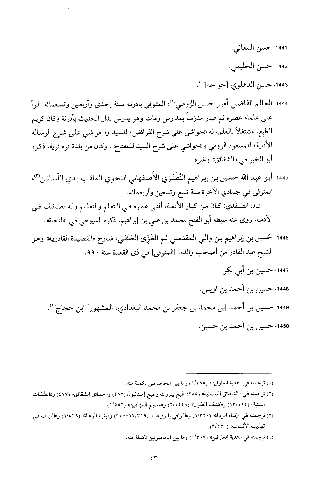1444 - العالم الفاضل أمير حسن الرُّومي (¬2)، المتوفى بأدرنه سنة إحدى وأربعين وتسعمائة. قرأ على علماء عصره ثم صار مدرِّساً بمدارس ومات وهو يدرس بدار الحديث بأدرنة وكان كريم الطبع، مشتغلاً بالعلم، له "حواشي على شرح الفرائض" للسيد و"حواشي على شرح الرسالة الأدبية" للمسعود الرومي و"حواشي على شرح السيد للمفتاح". وكان من بلدة قره فرية. ذكره أبو الخير في "الشقائق" وغيره.