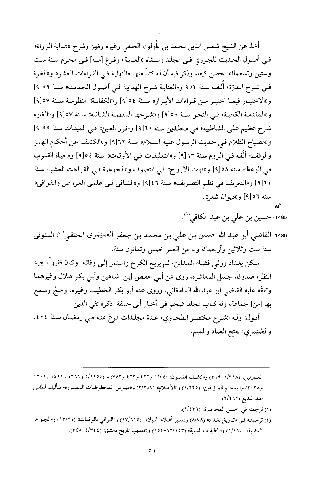 1486 - القاضي أبو عبد الله حسين بن علي بن محمد بن جعفر الصميري الحنفي (¬2)، المتوفى سنة ست وثلاثين وأربعمائة وله من العمر خمس وثمانون سنة.
