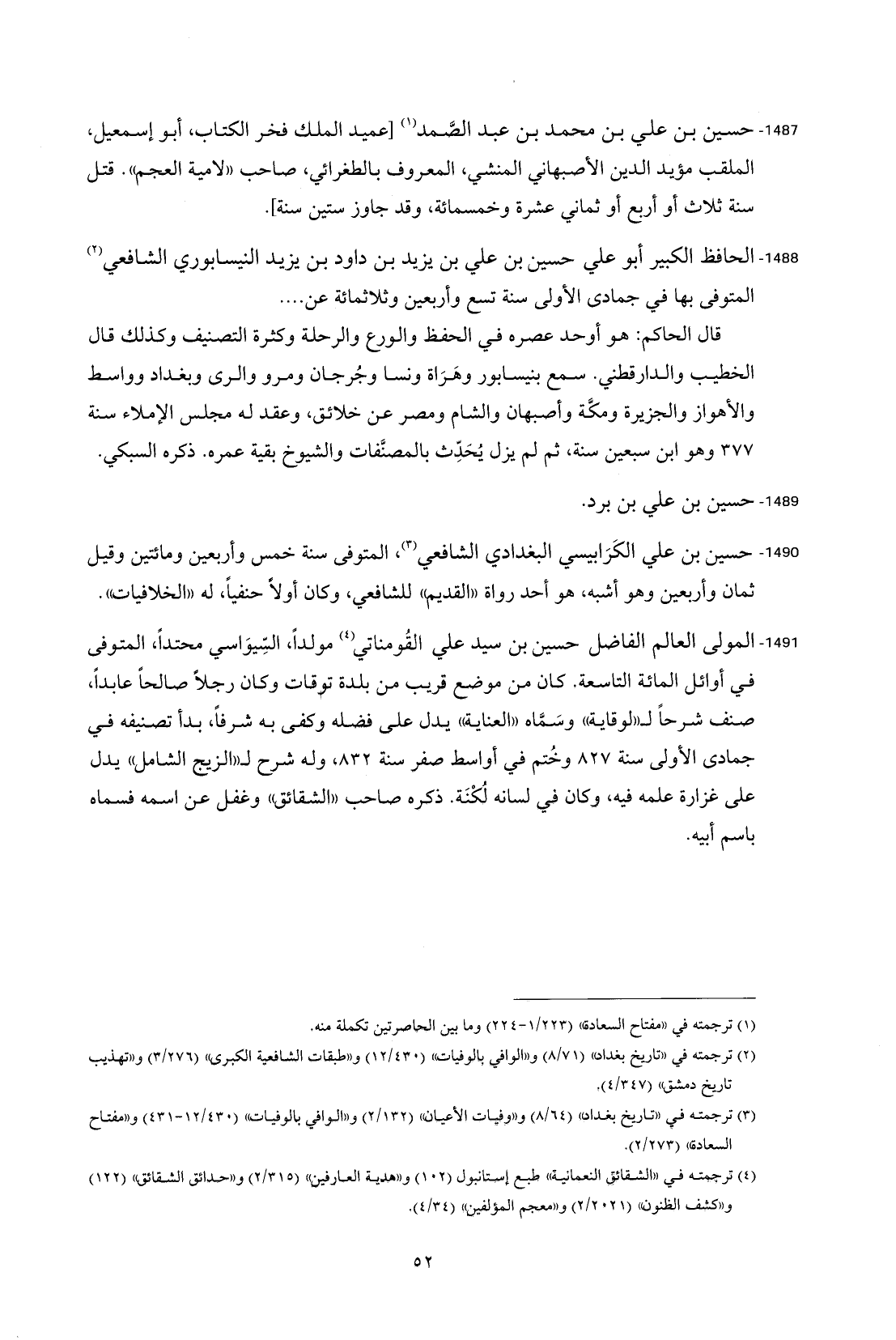 1490 - حسين بن علي الكَرَابيسي البغدادي الشافعي (¬3)، المتوفى سنة خمس وأربعين ومائتين وقيل ثمان وأربعين وهو أشبه، هو أحد رواة "القديم" للشافعي، وكان أولاً حنفياً، له "الخلافيات".