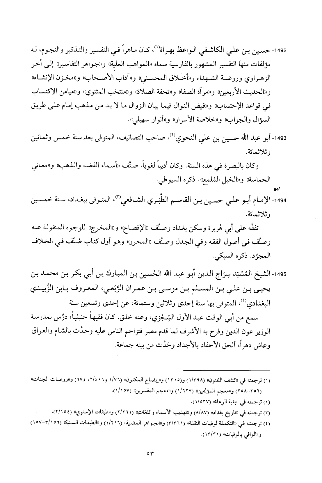 1494 - الإمام أبو علي حسين بن القاسم الطَّبَري الشافعي (¬3)، المتوفى ببغداد، سنة خمسين وثلاثمائة.