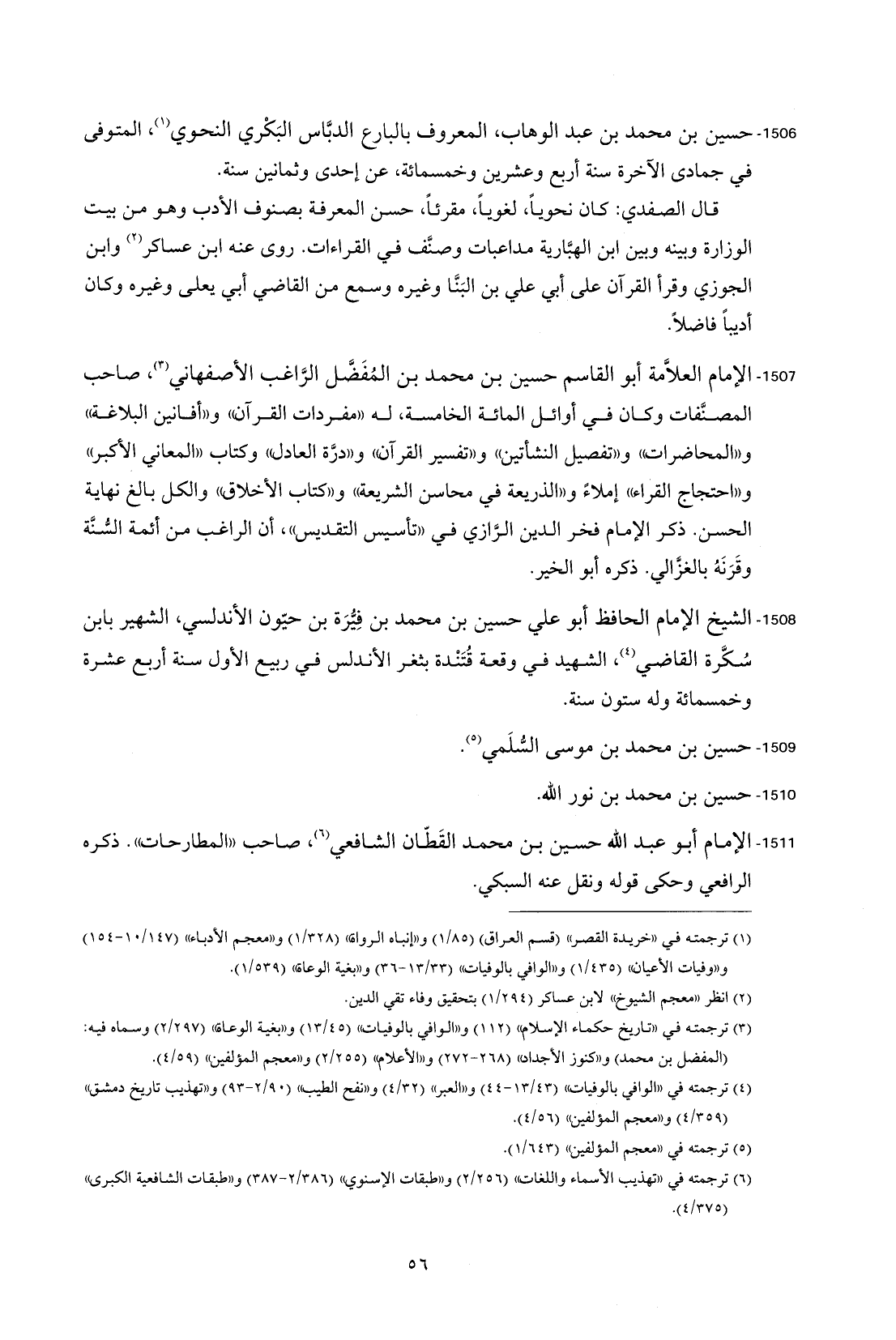 1507 - الإمام العلاَّمة أبو القاسم حسين بن محمد بن المُفَضَّل الرَّاغب الأصفهاني (¬3)، صاحب المصنَّفات وكان في أوائل المائة الخامسة، له "مفردات القرآن" و"أفانين البلاغة" و"المحاضرات" و"تفصيل النشأتين " و"تفسير القرآن" و"درَّة العادل" وكتاب "المعاني الأكبر" و"احتجاج القراء" إملاء و"الذريعة في محاسن الشريعة" و"كتاب الأخلاق" والكل بالغ نهاية الحسن. ذكر الإمام فخر الدين الرَّازي في "تأسيس التقديس"، أن الراغب من أئمة السنَّة وقَرَنَهُ بالغزَّالي. ذكره أبو الخير.