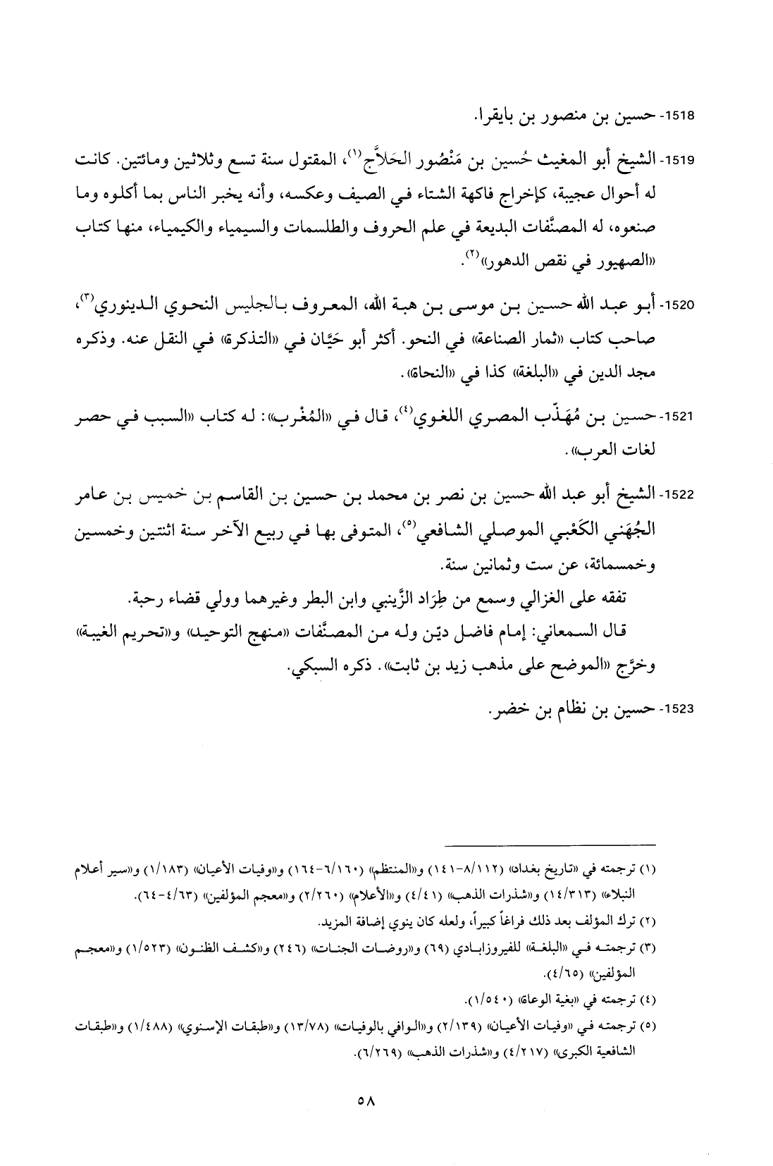 1522 - الشيخ أبو عبد الله حسين بن نصر بن محمد بن حسين بن القاسم بن خميس بن عامر الجُهَني الكَعْبي الموصلي الشافعي (¬5)، المتوفى بها في ربيع الآخر سنة اثنتين وخمسين وخمسمائة، عن ست وثمانين سنة.