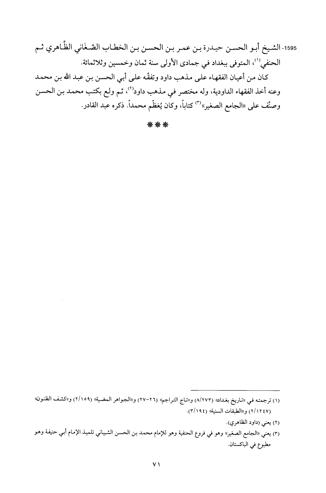 1595 - الشيخ أبو الحسن حيدرة بن عمر بن الحسن بن الخطاب الصَّغَاني الظَّاهري ثم الحنفي (¬1)، المتوفى ببغداد في جمادى الأولى سنة ثمان وخمسين وثلاثمائة.