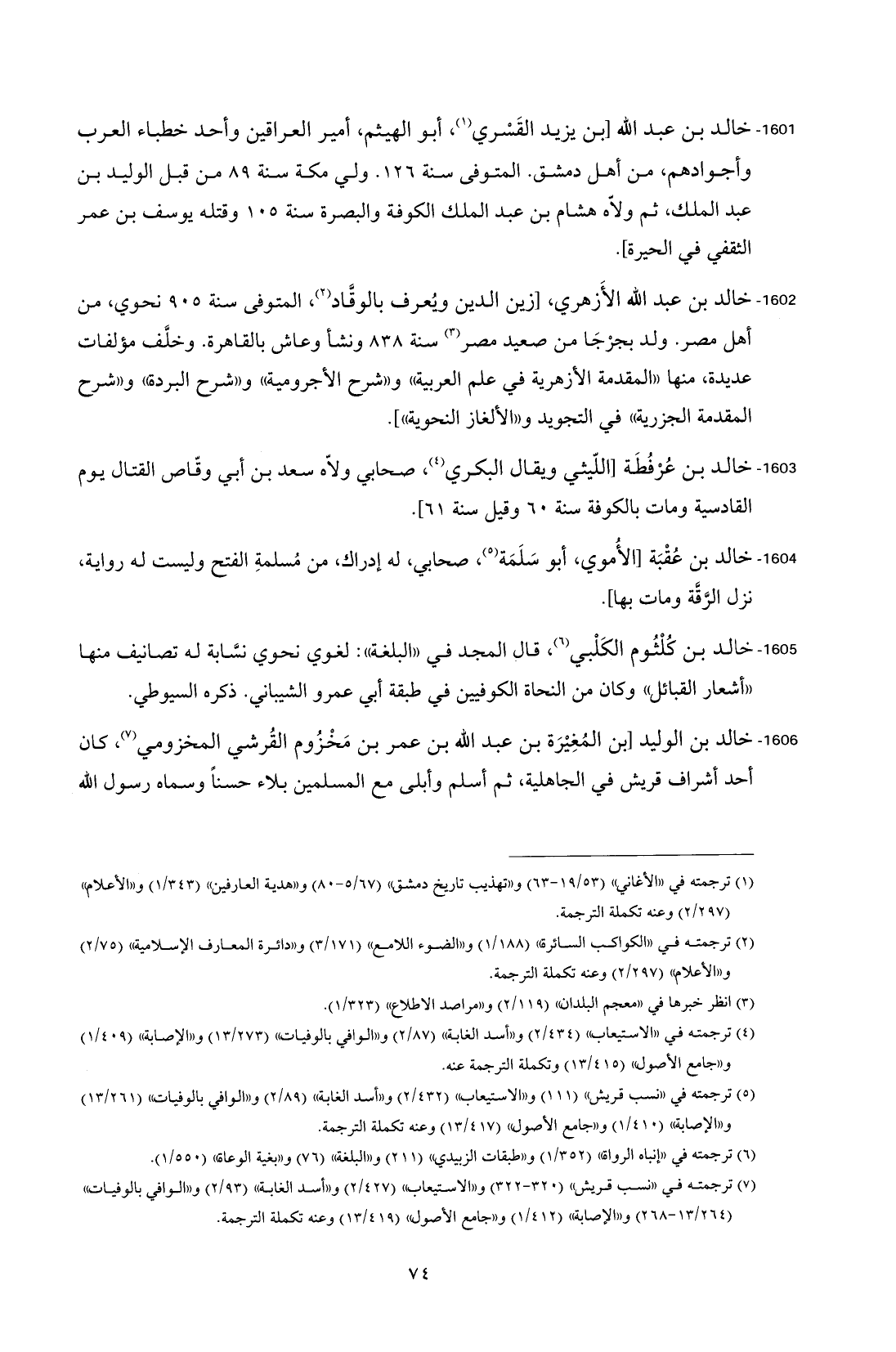 1605 - خالد بن كُلْثُوم الكَلْبي (¬6)، قال المجد في "البلغة": لغوي نحوي نسَّابة له تصانيف منها "أشعار القبائل" وكان من النحاة الكوفيين في طبقة أبي عمرو الشيباني. ذكره السيوطي.