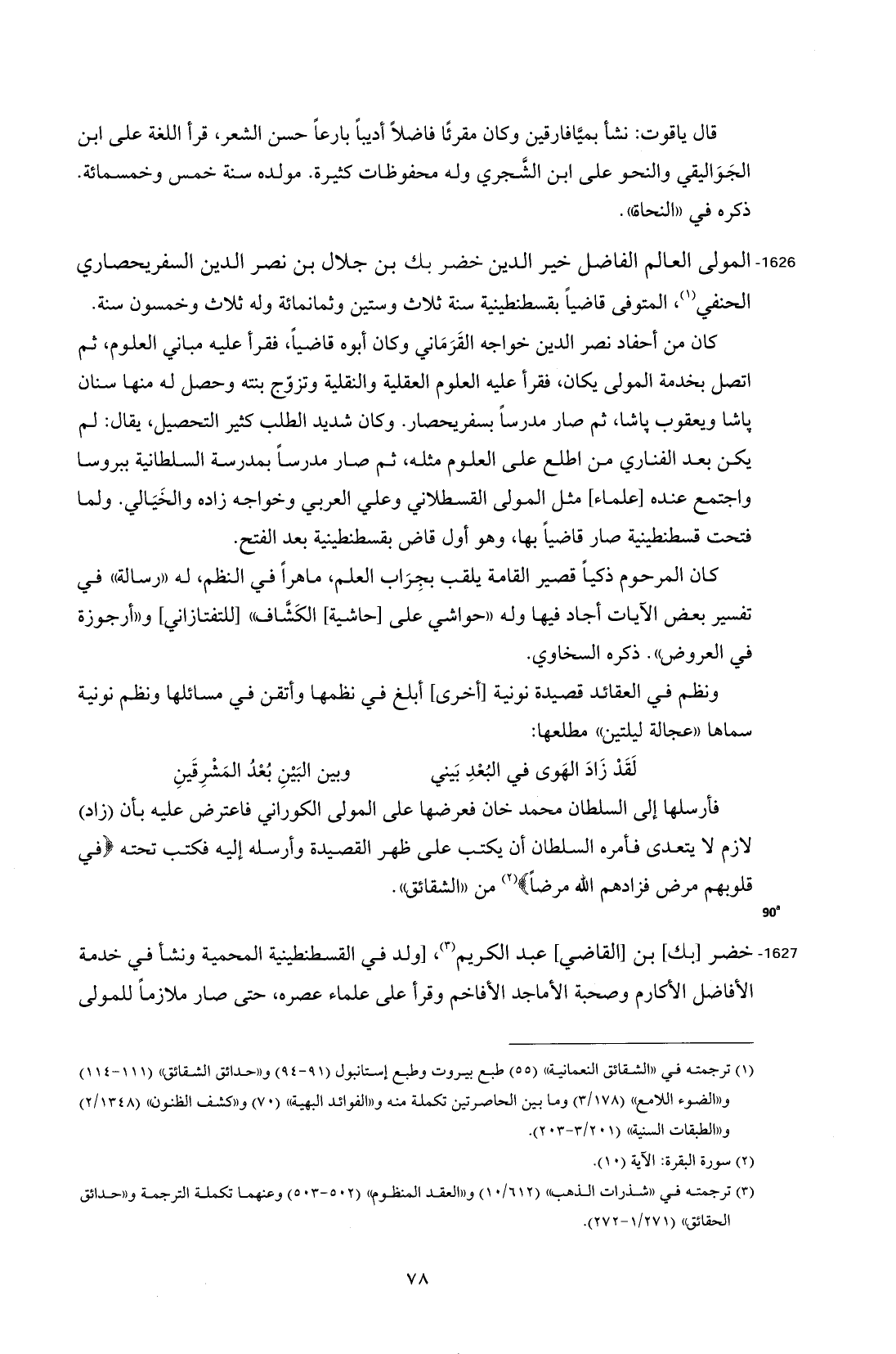 1627 - خضر [بك] بن [القاضي] عبد الكريم (¬3)، [ولد في القسطنطينية المحمية ونشأ في خدمة الأفاضل الأكارم وصحبة الأماجد الأفاخم وقرأ على علماء عصره، حتى صار ملازماً للمولى
