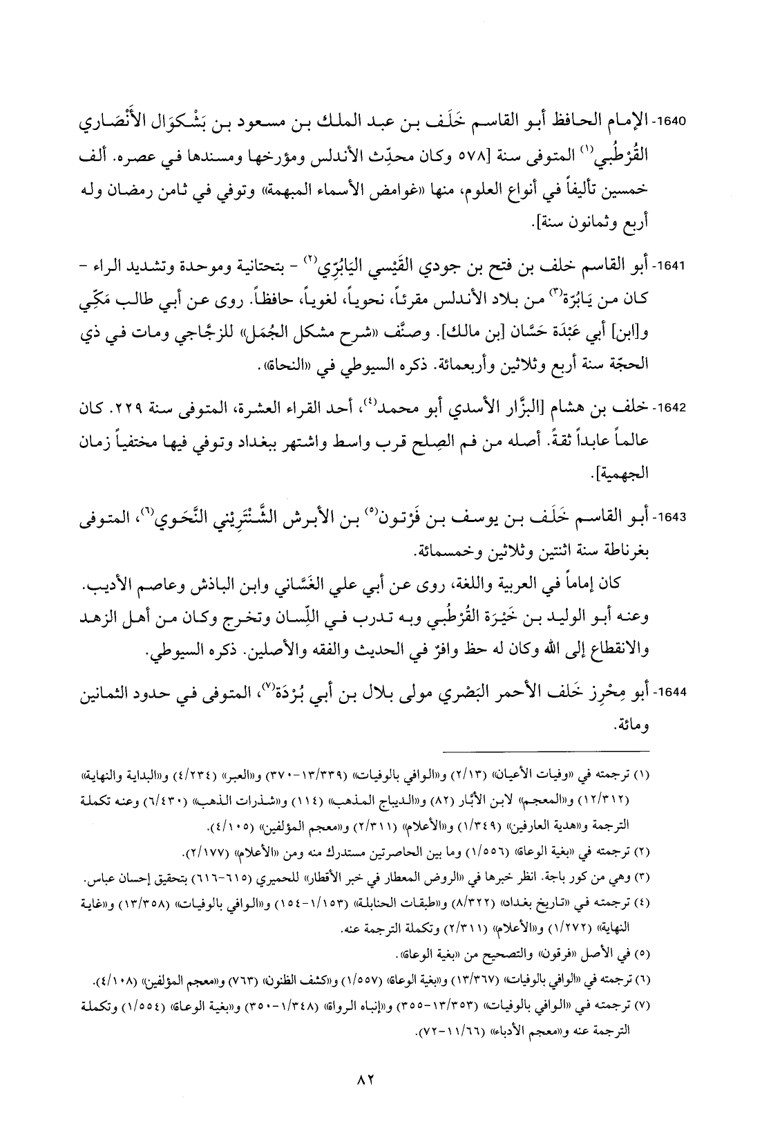 1640 - الإمام الحافظ أبو القاسم خَلَف بن عبد الملك بن مسعود بن بَشْكوَال الأَنْصَاري القُرْطُبي (¬1) المتوفى سنة [578 وكان محدِّث الأندلس ومؤرخها ومسندها في عصره. ألف خمسين تأليفاً في أنواع العلوم، منها "غوامض الأسماء المبهمة" وتوفي في ثامن رمضان وله أربع وثمانون سنة].