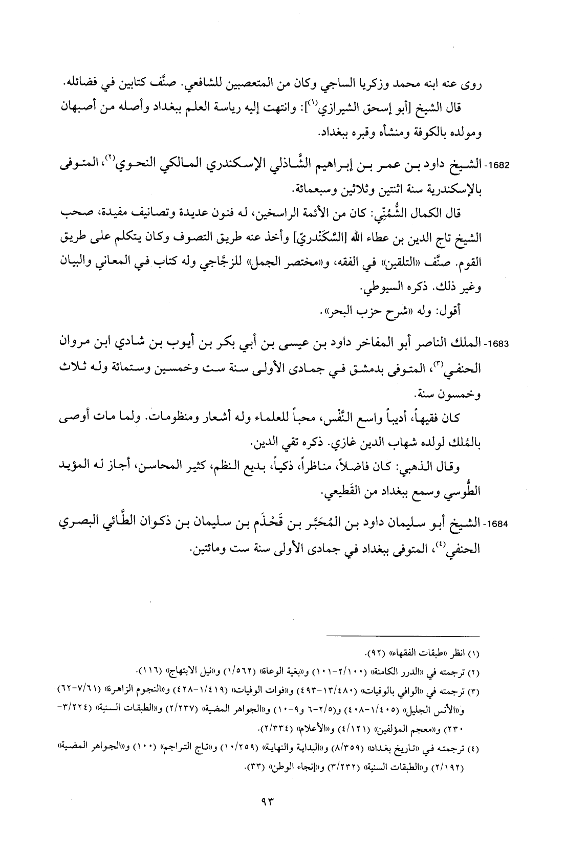1684 - الشيخ أبو سليمان داود بن المُحَبَّر بن قَحْذَم بن سليمان بن ذكوان الطَّائي البصري الحنفي (¬4)، المتوفى ببغداد في جمادى الأولى سنة ست ومائتين.