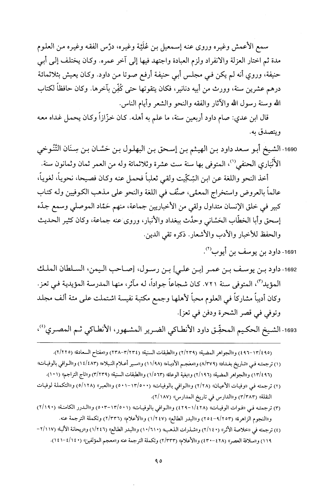 1690 - الشيخ أبو سعد داود بن الهيثم بن إسحق بن البهلول بن حَسَّان بن سِنَان التَّنوخي الأَنْبَاري الحنفي (¬1)، المتوفى بها سنة ست عشرة وثلاثمائة وله من العمر ثمان وثمانون سنة.