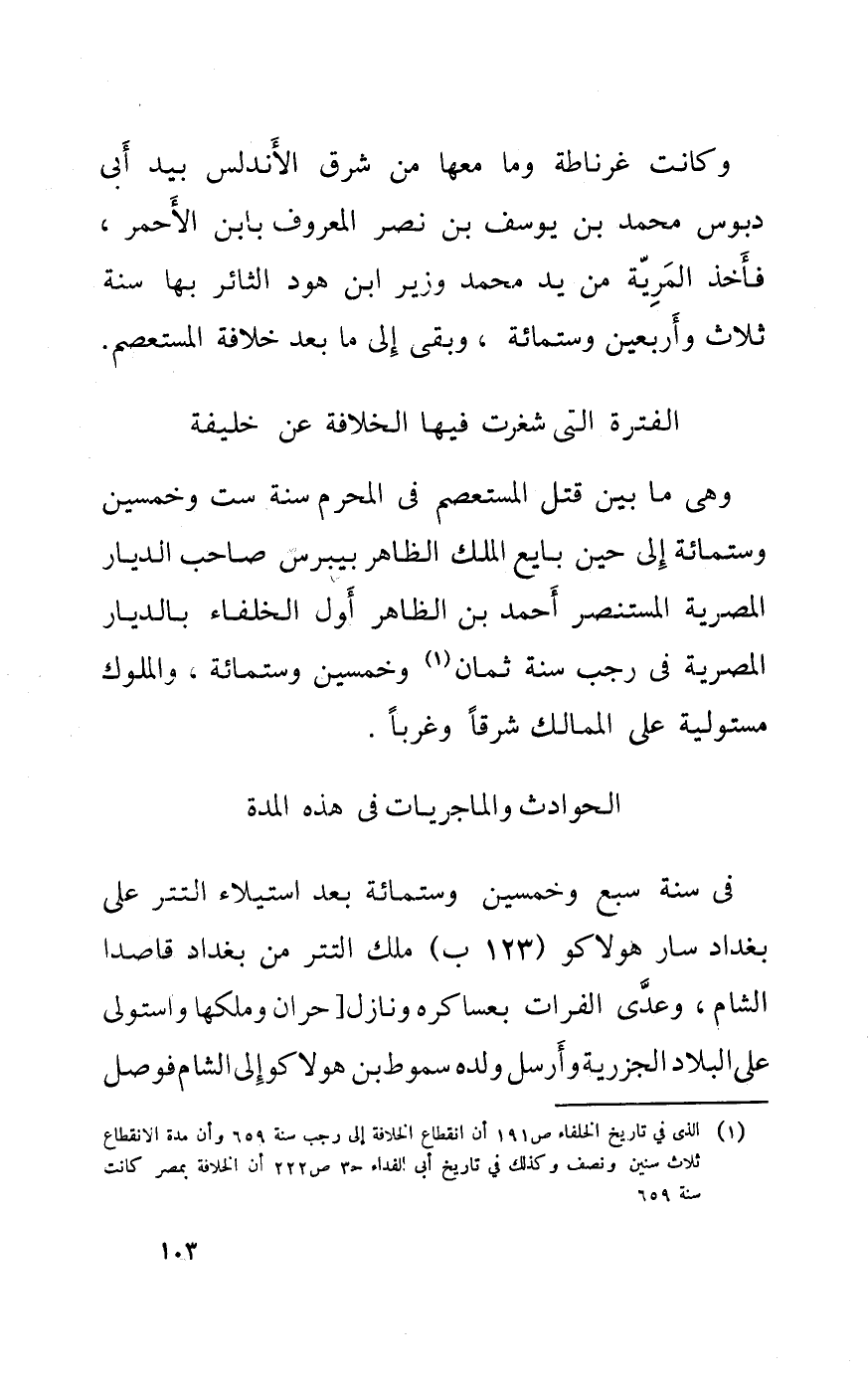 وَهِي مَا بَين قتل المستعصم فِي الْمحرم سنة سِتّ وَخمسين وسِتمِائَة الى حِين بَايع الْملك الظَّاهِر بيبرس صَاحب الديار المصرية الْمُسْتَنْصر أَحْمد بن الظَّاهِر أول الْخُلَفَاء بالديار المصرية فِي رَجَب سنة ثَمَان وَخمسين وسِتمِائَة والملوك مستولية على الممالك شرقا وغربا