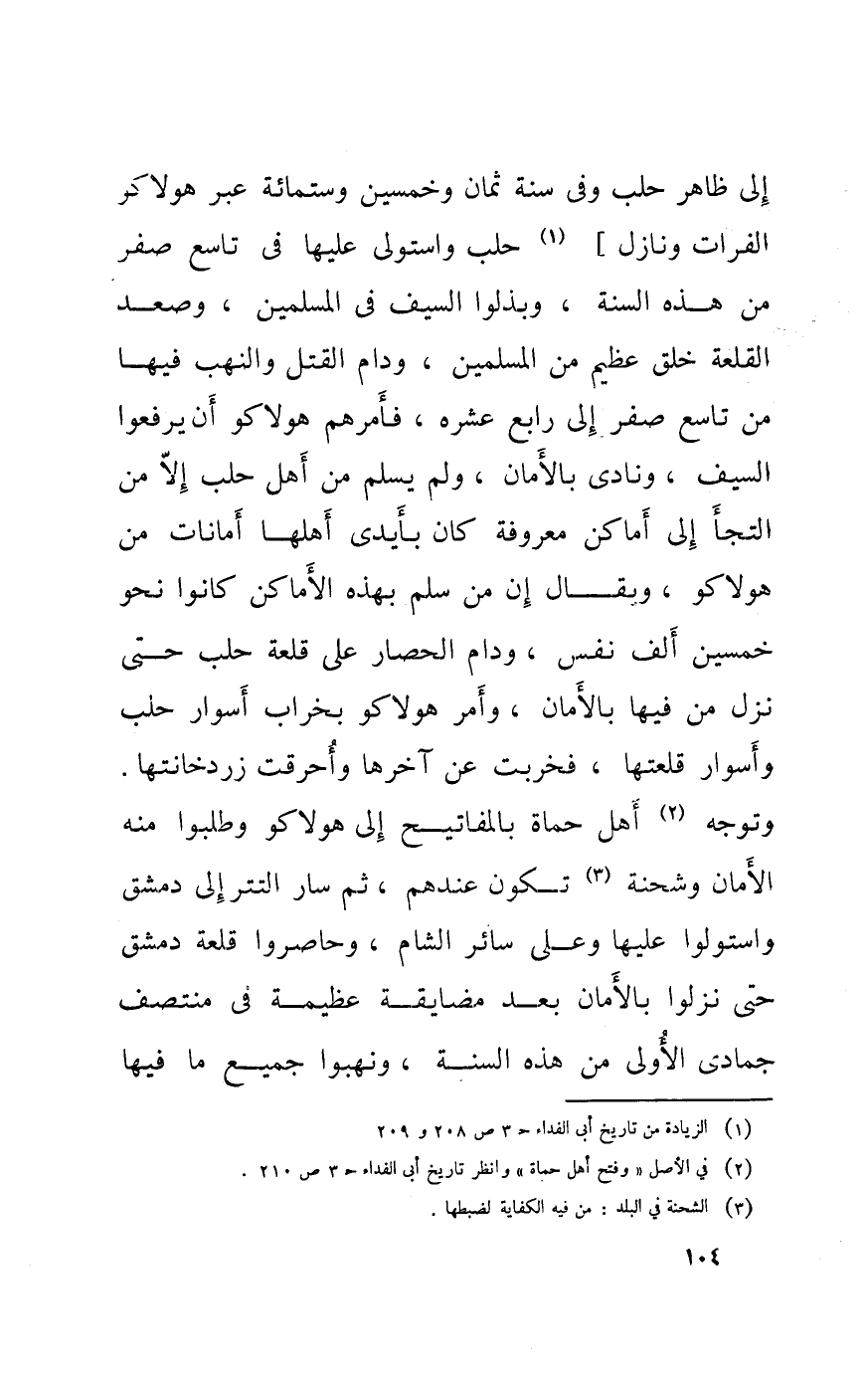الى ظَاهر حلب وَفِي سنة ثَمَان وَخمسين وسِتمِائَة عبر هولاكو الْفُرَات ونازل حلب وَاسْتولى عَلَيْهَا فِي تَاسِع صفر من هَذِه السّنة وبذلوا السَّيْف فِي الْمُسلمين وَصعد القلعة خلق عَظِيم من الْمُسلمين ودام الْقَتْل والنهب فِيهَا من تَاسِع صفر الى رَابِع عشرَة فَأَمرهمْ هولاكو أَن يرفعوا السَّيْف ونادى بالأمان وَلم يسلم من اهل حلب إِلَّا من التجأ الى أَمَاكِن مَعْرُوفَة كَانَ بأيدي اهلها أمانات من هولاكو وَيُقَال إِن من سلم بِهَذِهِ الْأَمَاكِن كَانُوا نَحْو خمسين الف نفس ودام الْحصار على قلعة حلب حَتَّى نزل من فِيهَا بالأمان وَأمر هولاكو بخراب اسوار حلب وأسوار قلعتها فخربت عَن آخرهَا وأحرقت زردخانتها وَتوجه أهل حماة بالمفاتيح إِلَى هولاكو وطلبوا مِنْهُ الْأمان وشحنة تكون عِنْدهم ثمَّ سَار التتر إِلَى دمشق وأستولوا عَلَيْهَا وعَلى سَائِر الشَّام وحاصروا قلعة دمشق حَتَّى نزلُوا بالأمان بعد مضايقة عَظِيمَة فِي منتصف جُمَادَى الأولى من هَذِه السّنة ونهبوا جَمِيع مَا فِيهَا