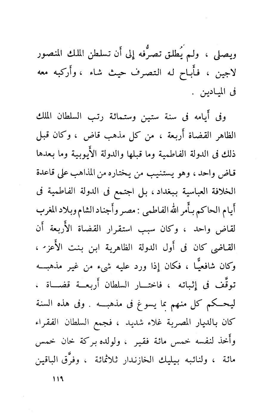 وفى أَيَّامه فِي سنة سِتِّينَ وسِتمِائَة رتب السُّلْطَان الْملك الظَّاهِر الْقُضَاة أَرْبَعَة من كل مَذْهَب قَاض وَكَانَ قبل ذَلِك فِي الدولة الفاطمية وَمَا قبلهَا والدولة الأيوبية وَمَا بعْدهَا قَاض وَاحِد وَهُوَ يَسْتَنِيب من يختاره من الْمذَاهب على قَاعِدَة الْخلَافَة العباسية بِبَغْدَاد بل اجْتمع فِي الدولة الفاطمية فِي أَيَّام الْحَاكِم بِأَمْر الله الفاطمى مصر وأجناد الشَّام وبلاد الْمغرب لقاض وَاحِد وَكَانَ سَبَب اسْتِقْرَار الْقُضَاة الْأَرْبَعَة أَن القَاضِي كَانَ فِي اول ل الدولة الظَّاهِرِيَّة ابْن بنت الْأَعَز وَكَانَ شافعيا فَكَانَ إِذا ورد عَلَيْهِ شئ من غير مذْهبه توقف فِي إثْبَاته فَاخْتَارَ السُّلْطَان أَرْبَعَة قُضَاة ليحكم كل مِنْهُم بِمَا يسوغ فِي مذْهبه وفى هَذِه السّنة كَانَ بالديار المصرية غلاء شَدِيد فَجمع السُّلْطَان الْفُقَرَاء وَأخذ لنَفسِهِ خمس مائَة فَقير ولولده بركَة خَان خمس مائَة ولنائبه بيليك الخازندار ثَلَاثمِائَة وَفرق البَاقِينَ