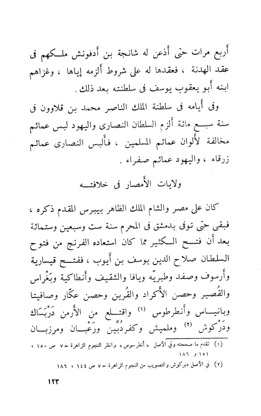 وَفِي أَيَّامه فِي سلطنة الْملك النَّاصِر مُحَمَّد بن قلاوون فِي سنة سبع مائَة ألزم السُّلْطَان النَّصَارَى وَالْيَهُود لبس عمائم مُخَالفَة لألوان عمائم الْمُسلمين فألبس النَّصَارَى عمائم زرقاء وَالْيَهُود عمائم صفراء