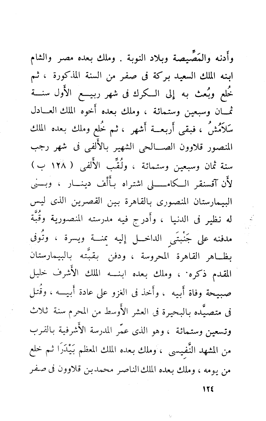 وأدنة والمصيصة وبلاد النّوبَة وَملك بعده مصر وَالشَّام ابْنه الْملك السعيد بركَة فِي صفر من السّنة الْمَذْكُورَة ثمَّ خلع وَبعث بِهِ إِلَى الكرك فِي شهر ربيع الأول سنة ثَمَان وَسبعين وست مائَة وَملك بعده أَخُوهُ الْملك الْعَادِل سلامش فَبَقيَ أَرْبَعَة أشهر ثمَّ خلع وَملك بعده الْملك الْمَنْصُور قلاوون الصَّالِحِي الشهير بالألفي فِي شهر رَجَب سنة ثَمَان وَسبعين وسِتمِائَة ولقب الألفي لِأَن آقسنقر الكاملي إشتراه بِأَلف دِينَار وَبنى البيمارستان المنصوري بِالْقَاهِرَةِ بَين القصرين الَّذِي لَيْسَ لَهُ نَظِير فِي الدُّنْيَا وأدرج فِيهِ مدرسته المنصورية وقبة مدفنة على جنبتي الدَّاخِل إِلَيْهِ يمنة ويسرة وَتُوفِّي بِظَاهِر الْقَاهِرَة المحروسة وَدفن بقبته بالبيمارستان الْمُقدم ذكره وَملك بعده ابْنه الْملك الْأَشْرَف خَلِيل صَبِيحَة وَفَاة أَبِيه وَأخذ فِي الْغَزْو على عَادَة أَبِيه وَقتل فِي متصيده بالبحيرة فِي الْعشْر الْأَوْسَط من الْمحرم سنة ثَلَاث وَتِسْعين وسِتمِائَة وَهُوَ الَّذِي عمر الْمدرسَة الأشرفية بِالْقربِ من المشهد النفيسي وَملك بعده الْملك الْمُعظم بيدرا ثمَّ خلع من يَوْمه وَملك بعده الْملك النَّاصِر مُحَمَّد بن قلاوون فِي صفر