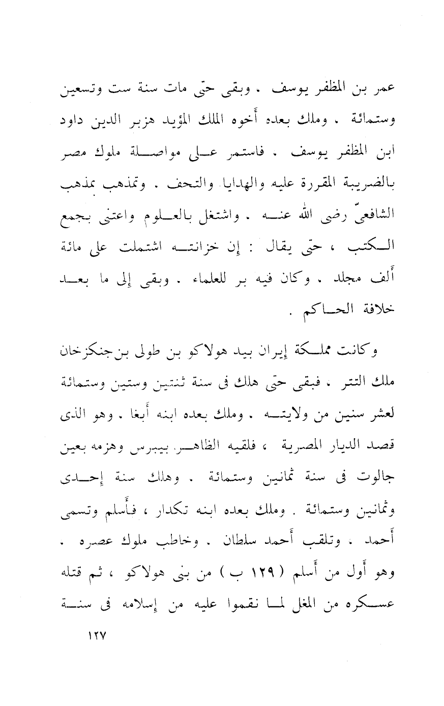 وَكَانَت مملكة إيران بيد هولاكو بن طولى بن جنكزخان ملك التتر فبقى حَتَّى هلك فِي سنة ثِنْتَيْنِ وَسِتِّينَ وسِتمِائَة لعشر سِنِين من ولَايَته وَملك بعده ابْنه أبغا وَهُوَ الذى قصد الديار المصرية فَلَقِيَهُ الظَّاهِر بيبرس وهزمه بِعَين جالوت فِي سنة ثَمَانِينَ وسِتمِائَة وَهلك سنة أحدى وَثَمَانِينَ وسِتمِائَة وَملك بعده ابْنه تكدار فَأسلم وَتسَمى احْمَد وتلقب أَحْمد سُلْطَان وخاطب مُلُوك عصره وَهُوَ اول من أسلم من بنى هولاكو ثمَّ قَتله عسكره من الْمغل لما نقموا عَلَيْهِ من إِسْلَامه فِي سنة