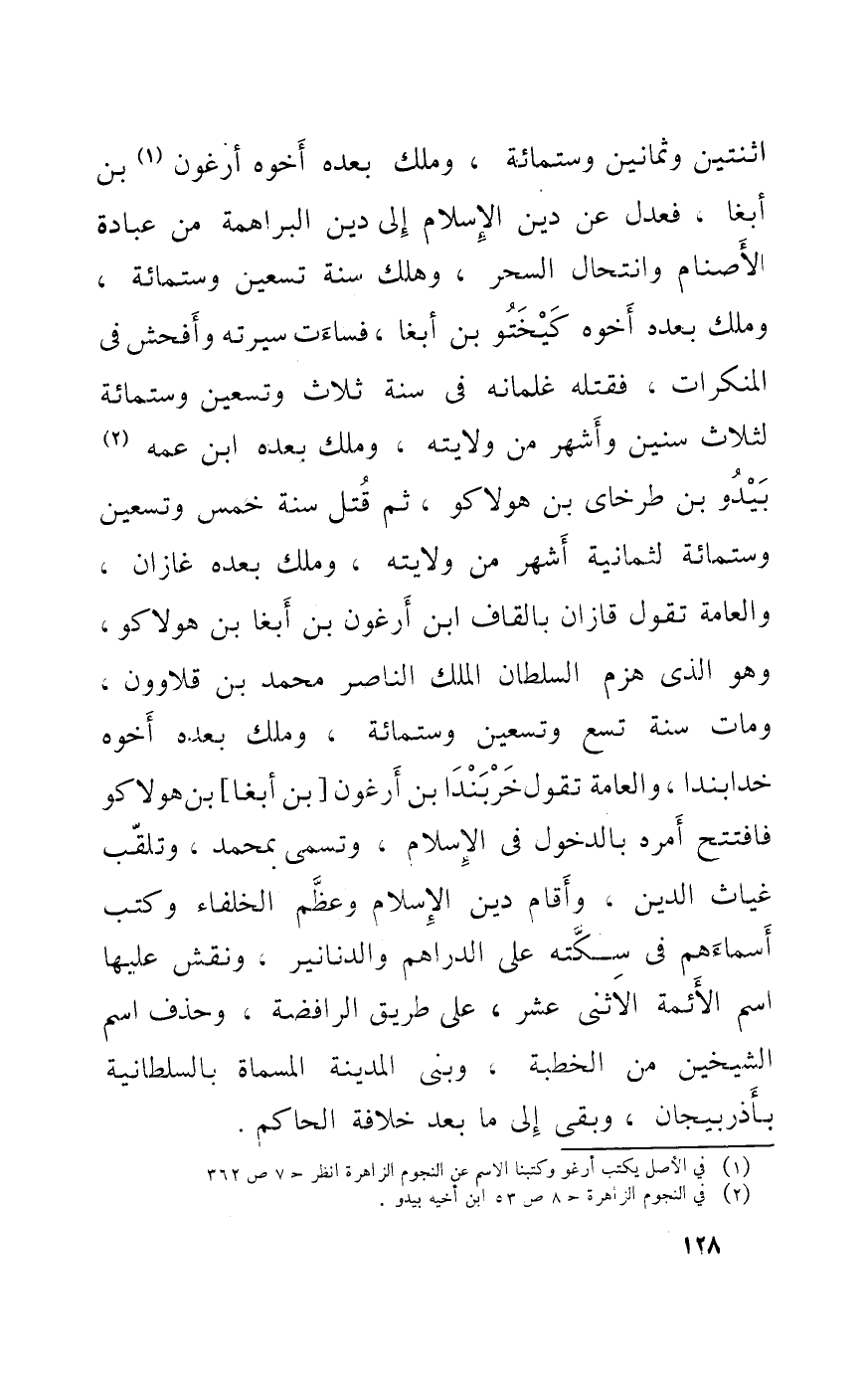 اثْنَتَيْنِ وَثَمَانِينَ وسِتمِائَة وَملك بعده أَخُوهُ أرغون بن أبغا فَعدل عَن دين الْإِسْلَام إِلَى دين البراهمة من عبَادَة الْأَصْنَام وانتحال السحر وَهلك سنة تسعين وسِتمِائَة وَملك بعده أَخُوهُ كيختو بن أبغا فَسَاءَتْ سيرته وأفحش فِي الْمُنْكَرَات فَقتله غلمانه فِي سنة ثَلَاث وَتِسْعين وسِتمِائَة لثلاث سِنِين وَأشهر من ولَايَته وَملك بعده ابْن عَمه بيدو بن طرخاي بن هولاكو ثمَّ قتل سنة خمس وَتِسْعين وسِتمِائَة لثمانية أشهر من ولَايَته وَملك بعده غازان والعامة تَقول قازان بِالْقَافِ ابْن أرغون بن أبغا بن هولاكو وَهُوَ الذى هزم السُّلْطَان الْملك النَّاصِر مُحَمَّد بن قلاوون وَمَات سنة تسع وَتِسْعين وسِتمِائَة وَملك بعده اخوه خدابندا والعامة تَقول خربندا بن أرغون بن أبغا بن هولاكو فَافْتتحَ أمره بِالدُّخُولِ فِي الْإِسْلَام وَتسَمى بِمُحَمد وتلقب غياث الدّين واقام دين الْإِسْلَام وَعظم الْخُلَفَاء وَكتب أَسْمَاءَهُم فِي سكته على الدَّرَاهِم وَالدَّنَانِير وَنقش عَلَيْهَا اسْم الْأَئِمَّة الاثنى عشر على طَرِيق الرافضة وَحذف اسْم الشَّيْخَيْنِ من الْخطْبَة وَبنى الْمَدِينَة الْمُسَمَّاة بالسلطانية بِأَذربِيجَان وبقى إِلَى مَا بعد خلَافَة الْحَاكِم