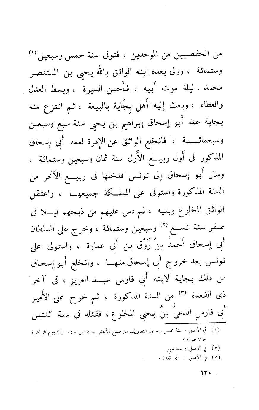 من الحفصيين من الْمُوَحِّدين فتوفى سنة خمس وَسبعين وسِتمِائَة وَولى بعده ابْنه الواثق بِاللَّه يحيى بن الْمُسْتَنْصر مُحَمَّد لَيْلَة موت أَبِيه فَأحْسن السِّيرَة وَبسط الْعدْل وَالعطَاء وَبعث إِلَيْهِ أهل بجاية بالبيعة ثمَّ انتزع مِنْهُ بجاية عَمه أَبُو إِسْحَاق إِبْرَاهِيم بن يحيى سنة سبع وَسبعين وَسَبْعمائة فانخلع الواثق عَن الإمرة لِعَمِّهِ أَبى إِسْحَاق الْمَذْكُور فِي أول ربيع الأول سنة ثَمَان وَسبعين وسِتمِائَة وَسَار أَبُو إِسْحَاق إِلَى تونس فَدَخلَهَا فِي ربيع الآخر من السّنة الْمَذْكُورَة وَاسْتولى على المملكة جَمِيعهَا واعتقل الواثق المخلوع وبنيه ثمَّ دس عَلَيْهِم من ذبحهم لَيْلًا فِي صفر سنة تسع وَسبعين وسِتمِائَة وَخرج على السُّلْطَان أَبى إِسْحَاق أَحْمد بن روق بن أَبى عمَارَة وَاسْتولى على تونس بعد خُرُوج أَبى إِسْحَاق مِنْهَا وانخلع أَبُو إِسْحَاق من ملك بجاية لدينِهِ أَبى فَارس عبد الْعَزِيز فِي آخر ذى الْقعدَة من السّنة الْمَذْكُورَة ثمَّ خرج على الْأَمِير أَبى فَارس الدعى بن يحيى المخلوع فَقتله فِي سنة اثْنَتَيْنِ