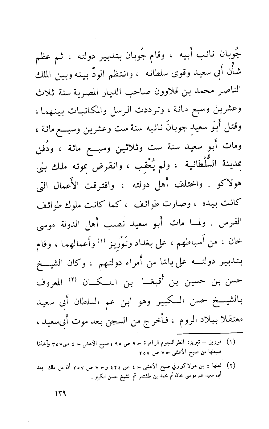 جوبان نَائِب أَبِيه وَقَامَ جوبان بتدبير دولته ثمَّ عظم شان أَبى سعيد وقوى سُلْطَانه وانتظم الود بَينه وَبَين الْملك النَّاصِر مُحَمَّد بن قلاوون صَاحب الديار المصرية سنة ثَلَاث وَعشْرين وَسبع مائَة وترددت الرُّسُل والمكاتبات بَينهمَا وَقتل أَبُو سعيد جوبان نائبة سنة سِتّ وَعشْرين وَسبع مائَة وَمَات أَبُو سعيد سنة سِتّ وَثَلَاثِينَ وَسبع مائَة وَدفن بِمَدِينَة السُّلْطَانِيَّة وَلم يعقب وانقرض بِمَوْتِهِ ملك بنى هولاكو وَاخْتلف أهل دولته وافترقت الْأَعْمَال الَّتِى كَانَت بِيَدِهِ وَصَارَت طوائف كَمَا كَانَت مُلُوك طوائف الْفرس وَلما مَاتَ أَبُو سعيد نصب أهل الدولة مُوسَى خَان من أسباطهم على بَغْدَاد وتوريز وأعمالهما وَقَامَ بتدبير دولته على باشا من أُمَرَاء دولتهم وَكَانَ الشَّيْخ حسن بن حُسَيْن بن أقبغا بن ابلكان الْمَعْرُوف بالشيخ حسن الْكَبِير وَهُوَ ابْن عَم السُّلْطَان أَبى سعيد معتقلا بِبِلَاد الرّوم فَأخْرج من السجْن بعد موت أَبى سعيد