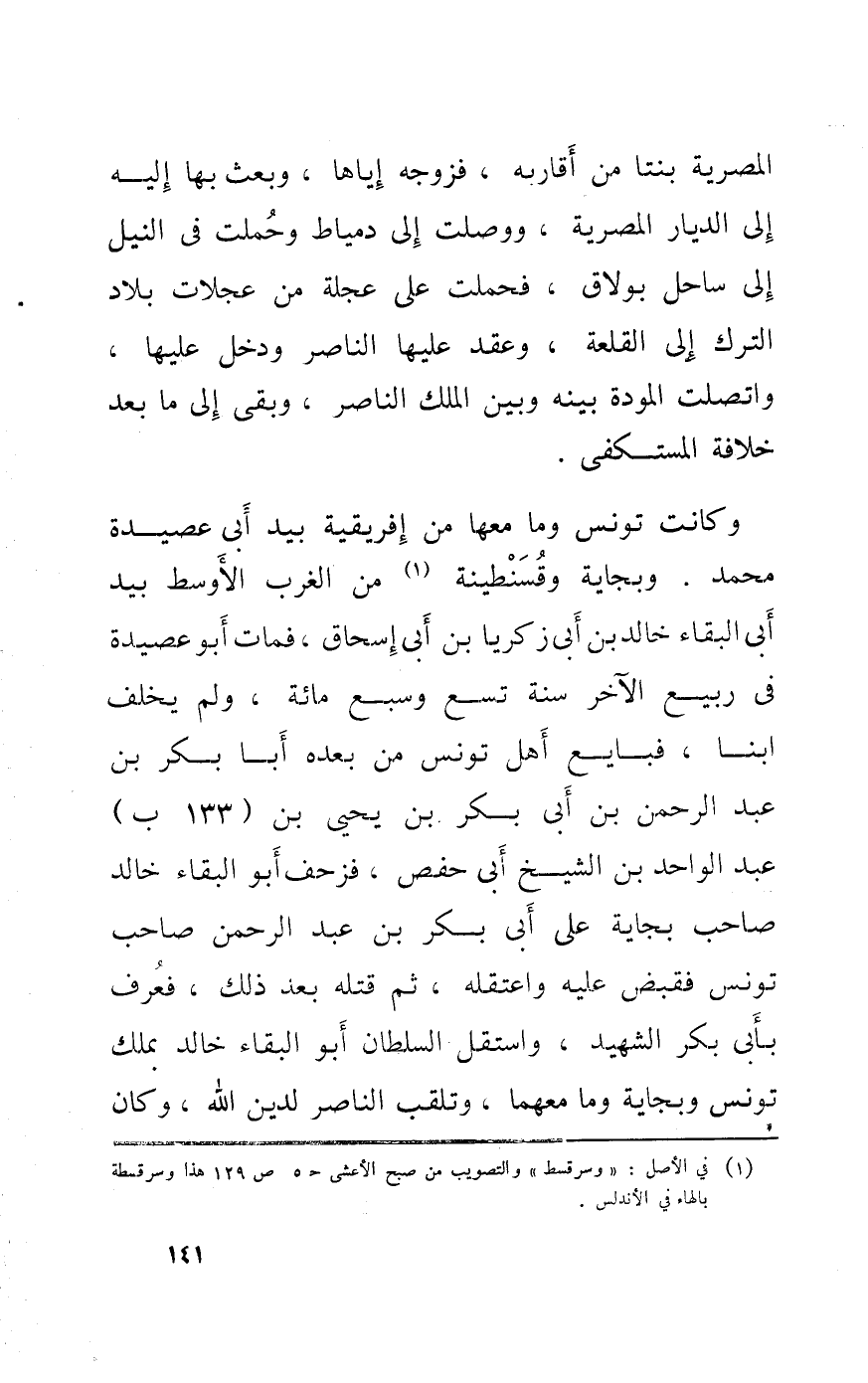 وَكَانَت تونس وَمَا مَعهَا من إفريقية بيد أَبى عصيدة مُحَمَّد وبجاية وقسنطينة من الغرب الْأَوْسَط بيد أَبى الْبَقَاء خَالِد بن أَبى زَكَرِيَّا بن أَبى إِسْحَاق فَمَاتَ أَبُو عصيدة فِي ربيع الآخر سنة ستع وَسبع مائَة وَلم يخلف ابْنا فَبَايع أهل تونس من بعده أَبَا بكر بن عبد الرَّحْمَن بن أَبى بكر بن يحيى بن عبد الْوَاحِد بن الشَّيْخ أَبى حَفْص فزحف أَبُو الْبَقَاء خَالِد صَاحب بجاية على أَبى بكر بن عبد الرَّحْمَن صَاحب تونس فَقبض عَلَيْهِ واعتقله ثمَّ قَتله بعد ذَلِك فَعرف بأبى بكر الشَّهِيد واستقل السُّلْطَان أَبُو الْبَقَاء خَالِد بِملك تونس وبجاية وَمَا مَعَهُمَا وتلقب النَّاصِر لدين الله وَكَانَ