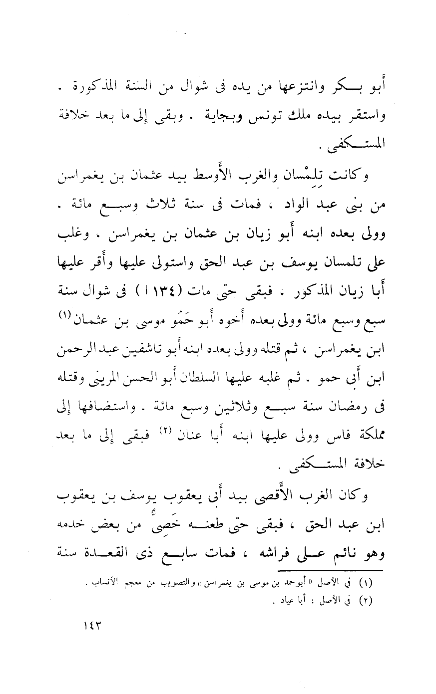 وَكَانَت تلمسان والغرب الْأَوْسَط بيد عُثْمَان بن يغمراسن من بنى عبد الواد فَمَاتَ فِي سنة ثَلَاث وَسبع مائَة وَولى بعده ابْنه أَبُو زيان بن عُثْمَان بن يغمراسن وَغلب على تلمسان يُوسُف بن عبد الْحق وَاسْتولى عَلَيْهَا وَأقر عَلَيْهَا أَبَا زيان الْمَذْكُور فبقى حَتَّى مَاتَ فِي شَوَّال سنة سبع وَسبع مائَة وَولى بعده اخوه أَبُو حمو مُوسَى بن عُثْمَان ابْن يغمراسن ثمَّ قَتله وَولى بعده ابْنه ابو تاشفين عبد الرَّحْمَن ابْن أَبى حمو ثمَّ غَلبه عَلَيْهَا السُّلْطَان أَبُو الْحسن المرينى وَقَتله فِي رَمَضَان سنة سبع وَثَلَاثِينَ وَسبع مائَة واستضافها إِلَى مملكة فاس وَولى عَلَيْهَا ابْنه أَبَا عنان فبقى إِلَى مَا بعد خلَافَة المستكفى