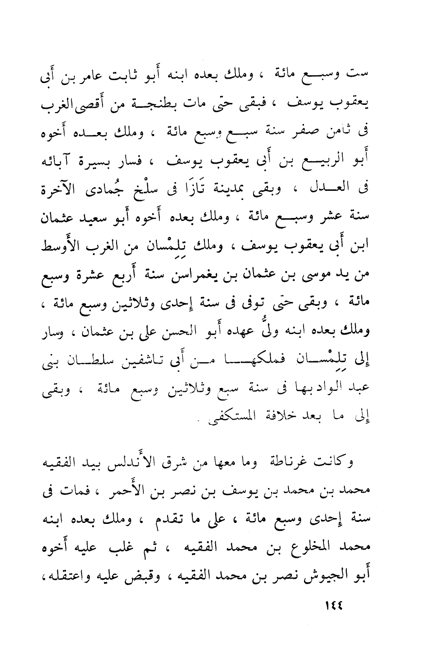 سِتّ وَسبع مائَة وَملك بعده ابْنه أَبُو ثَابت عَامر بن أَبى يَعْقُوب يُوسُف فبقى حَتَّى مَاتَ بطنجة من اقصى الغرب فِي ثامن صفر سنة سبع وَسبع مائَة وَملك بعده أَخُوهُ أَبُو الرّبيع بن أَبى يَعْقُوب يُوسُف فَسَار بسيرة آبَائِهِ فِي الْعدْل وبقى بِمَدِينَة تازا فِي سلخ جُمَادَى الآخر سنة عشر وَسبع مائَة وَملك بعده أَخُوهُ أَبُو سعيد عُثْمَان ابْن أَبى يَعْقُوب يُوسُف وَملك تلمسان من الغرب الْأَوْسَط من يَد مُوسَى بن عُثْمَان بن يغمراسن سنة أَربع عشرَة وَسبع مائَة وبقى حَتَّى توفى فِي سنة إِحْدَى وَثَلَاثِينَ وَسبع مائَة وَملك بعده ابْنه ولى عَهده أَبُو الْحسن على بن عُثْمَان وَسَار إِلَى تلمسان فملكها من أَبى تاشفين سُلْطَان بنى عبد الواد بهَا فِي سنة سبع وَثَلَاثِينَ وَسبع مائَة وبقى إِلَى مَا بعد خلَافَة المستكفى