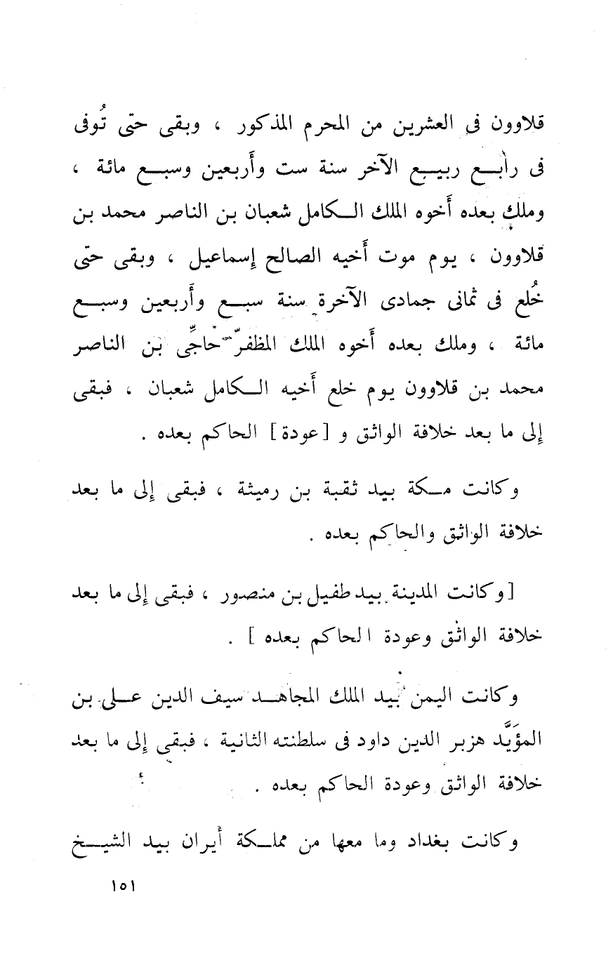 قلاوون فِي الْعشْرين من الْمحرم الْمَذْكُور وبقى حَتَّى توفى فِي رَابِع ربيع الآخر سنة سِتّ وَأَرْبَعين وَسبع مائَة وَملك بعده أَخُوهُ الْملك الْكَامِل شعْبَان بن النَّاصِر مُحَمَّد بن قلاوون يَوْم موت أَخِيه الصَّالح إِسْمَاعِيل وبقى حَتَّى خلع فِي ثمانى جُمَادَى الْآخِرَة سنة سبع وَأَرْبَعين وَسبع مائَة وَملك بعده اخوه الْملك المظفر حاجى بن النَّاصِر مُحَمَّد بن قلاوون يَوْم خلع أَخِيه الْكَامِل شعْبَان فبقى إِلَى مَا بعد خلَافَة الواثق وعودة الْحَاكِم بعده