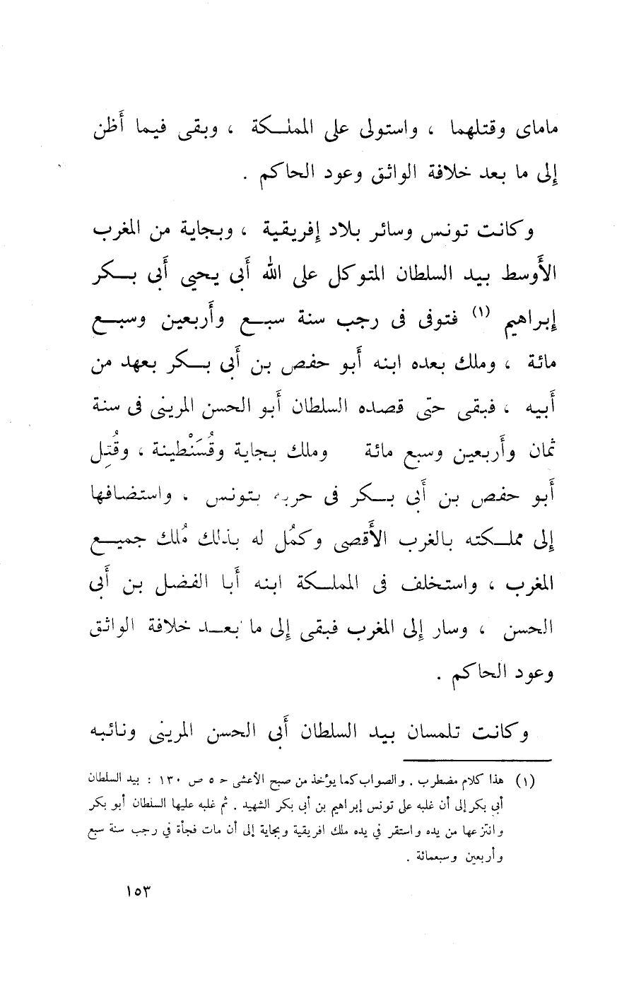 وَكَانَت تونس وَسَائِر بِلَاد أفريقية وبجاية من الغرب الْأَوْسَط بيد السُّلْطَان المتَوَكل على الله أَبى يحيى أَبى بكر إِبْرَاهِيم فتوفى فِي رَجَب سنة سبع وَأَرْبَعين وَسبع مائَة ومللك بعده ابْنه أَبُو حَفْص بن أَبى بكر بِعَهْد من أَبِيه فبقى حَتَّى قَصده السُّلْطَان أَبُو الْحسن المرينى فِي سنة ثَمَان وَأَرْبَعين وَسبع مائَة وَملك بجاية وقسنطينة وَقتل أبوحفص بن أَبى بكر فِي حَرْبَة بتونس واستضافها إِلَى مَمْلَكَته بالغرب الآقصى وكمل لَهُ بذلك ملك جَمِيع الْمغرب واستخلف فِي المملكة ابْنه أَبَا الْفضل بن أَبى الْحسن وَسَار إِلَى الْمغرب فبقى إِلَى مَا بعد خلَافَة الواثق وعود الْحَاكِم
