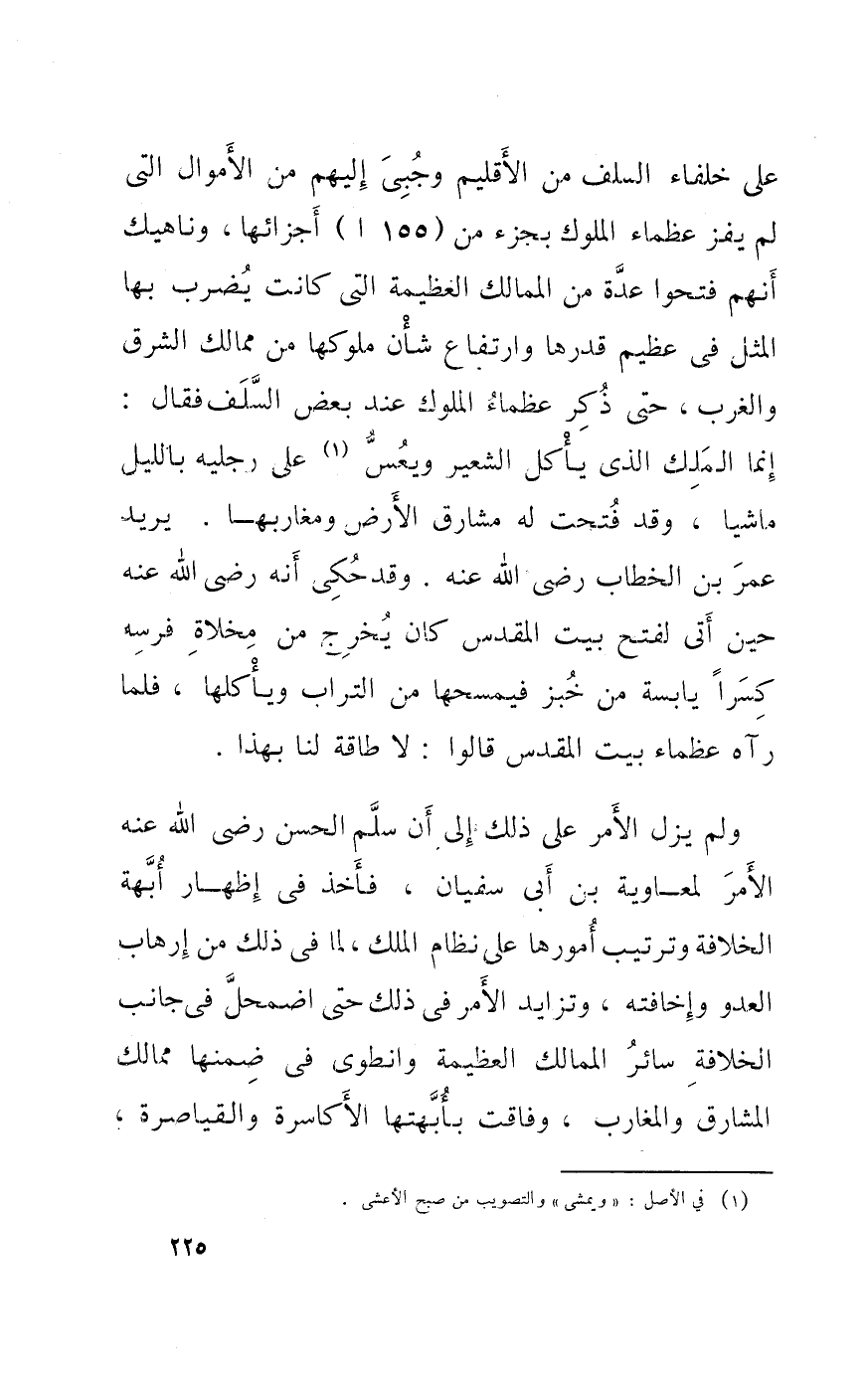 على خلفاء السّلف من الإقاليم وجبى إِلَيْهِم من الْأَمْوَال الَّتِى لم يفز عُظَمَاء الْمُلُوك بِجُزْء من أَجْزَائِهَا وناهيك انهم فتحُوا عدَّة من الممالك الْعَظِيمَة الَّتِى كَانَت يضْرب بهَا الْمثل فِي عَظِيم قدرهَا وارتفاع شَأْن مُلُوكهَا من ممالك الشرق والغرب حَتَّى ذكر عُظَمَاء الْمُلُوك عِنْد بعض السّلف فَقَالَ إِنَّمَا الْملك الذى يَأْكُل الشّعير ويعس على رجلَيْهِ بِاللَّيْلِ مَاشِيا وَقد فتحت لَهُ مَشَارِق الأَرْض وَمَغَارِبهَا يُرِيد عمر بن الْخطاب رضى الله عَنهُ وَقد حكى أَنه رضى الله عَنهُ حِين أَتَى لفتح بَيت الْمُقَدّس كَانَ يخرج من مخلاة فرسه كسرا يابسة من خبز فيمسحها من التُّرَاب ويأكلها فَلَمَّا رَآهُ عُظَمَاء بَيت الْمُقَدّس قَالُوا لَا طَاقَة لنا بِهَذَا