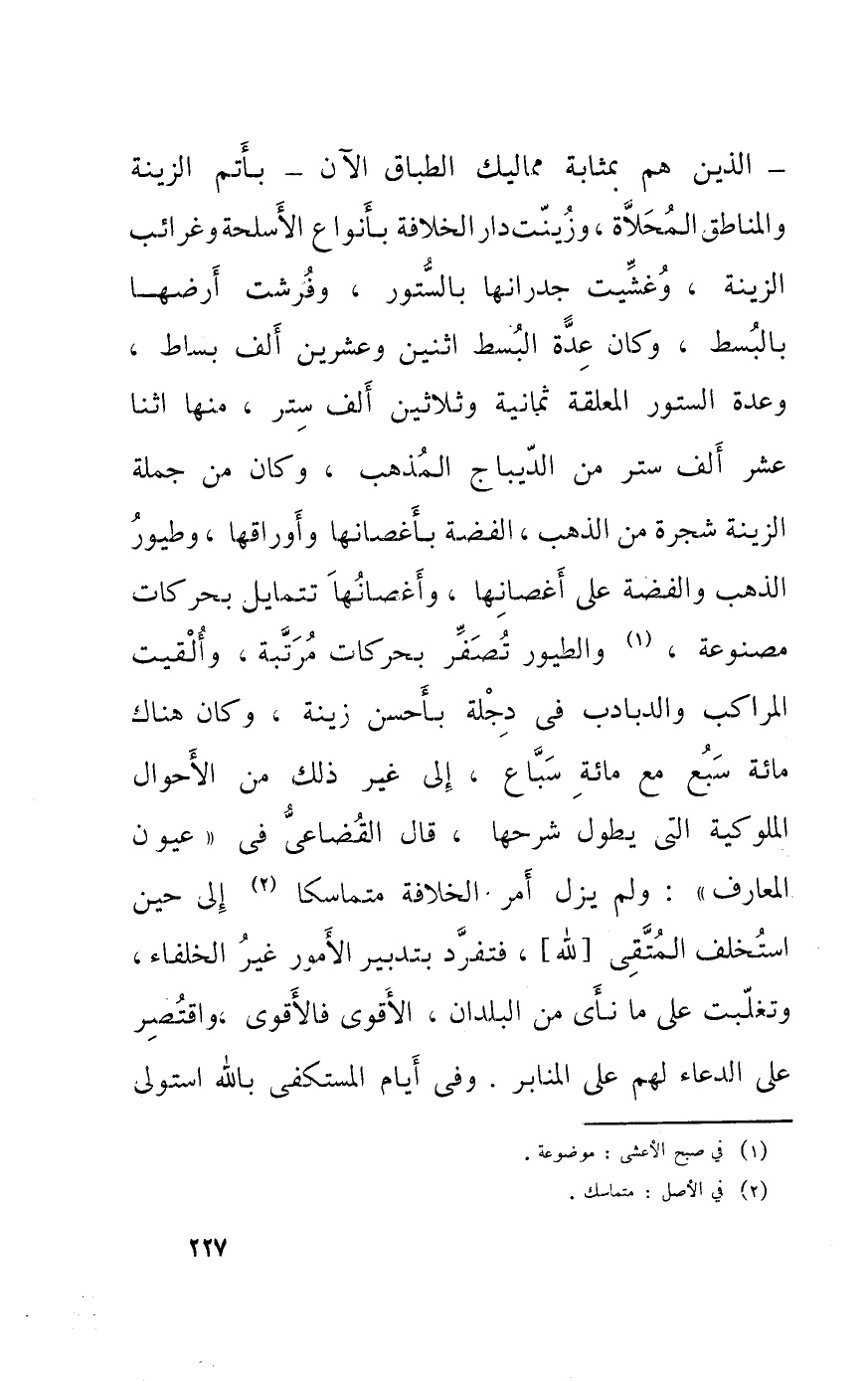 الَّذين هم بِمَثَابَة مماليك الطباق الْآن بأتم الزينه والمناطق المحلاه وزينت دَار الْخلَافَة بأنواع الأسلحة وغرائب الزينه وغشيت جدرانها بالستور وفرشت أرْضهَا بالبسط وَكَانَ عدَّة الْبسط أثنين وَعشْرين ألف بِسَاط وعدة الستور الْمُعَلقَة ثَمَانِيَة وَثَلَاثِينَ ألف ستر مِنْهَا أثني عشر الف ستر من الديباج الْمَذْهَب وَكَانَ من جملَة الزينه شَجَرَة من الذَّهَب الْفضة بأغصانها وأوراقها وطيور الذَّهَب وَالْفِضَّة على أَغْصَانهَا وَأَغْصَانهَا تتمايل بحركات مصنوعه والطيور تصفر بحركات مرتبَة وألقيت المراكب والدبادب فِي دجلة بِأَحْسَن زِينَة وَكَانَ هُنَاكَ مائَة سبع مَعَ مائَة سِبَاع إِلَى غير ذَلِك من الْأَحْوَال الملوكية الَّتِي يطول شرحها قَالَ الْقُضَاعِي فِي عُيُون المعارف وَلم يزل أَمر الْخلَافَة متماسكا إِلَى حِين أستخلف المتقي لله فتفرد بتدبير الْأُمُور غير الْخُلَفَاء وتغلبت على مَا نأى من الْبلدَانِ الْأَقْوَى فالأقوى وأقتصر على الدُّعَاء لَهُم على المنابر وَفِي أَيَّام المستكفي بِاللَّه أستولى