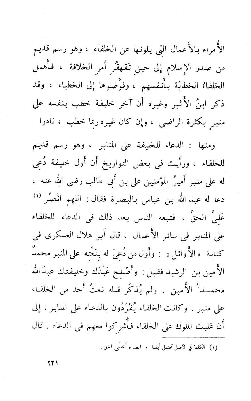 وَمِنْهَا الدُّعَاء للخليفة على المنابر وَهُوَ رسم قديم للخلفاء وَرَأَيْت فِي بعض التواريخ أَن أول خَليفَة دعى لَهُ على مِنْبَر أَمِير الْمُؤمنِينَ عَليّ بن ابي طَالب رَضِي الله عَنهُ دَعَا لَهُ عبد الله بن عَبَّاس بِالْبَصْرَةِ فَقَالَ اللَّهُمَّ انصر على الْحق فَتَبِعَهُ النَّاس بعد ذَلِك فِي الدُّعَاء للخلفاء على المنابر فِي سَائِر الاعمال قَالَ ابو هِلَال العسكري فِي كِتَابَة الْأَوَائِل وَأول من دعى لَهُ بنعته على الْمِنْبَر مُحَمَّد الْأمين بن الرشيد فَقيل وَأصْلح عَبدك وخليفتك عبد الله مُحَمَّدًا الْأمين وَلم يذكر قبله نعت أحد من الْخُلَفَاء على مِنْبَر وَكَانَت الْخُلَفَاء يفردون بِالدُّعَاءِ على المنابر الى أَن غلبت الْمُلُوك على الْخُلَفَاء فأشركوا مَعَهم فِي الدُّعَاء قَالَ