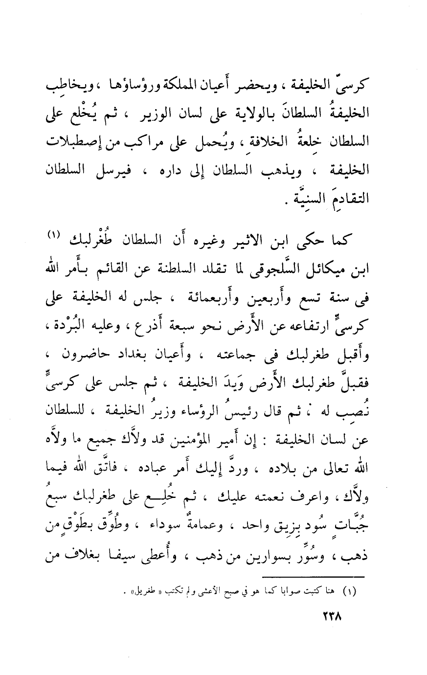 كَمَا حكى ابْن الاثير وَغَيره أَن السُّلْطَان طغرلبك ابْن ميكائل السلجوقى لما تقلد السلطنة عَن الْقَائِم بِأَمْر الله فِي سنة تسع وَأَرْبَعين وَأَرْبَعمِائَة جلس لَهُ الْخَلِيفَة على كرسى ارتفاعه عَن الأَرْض نَحْو سَبْعَة أَذْرع وَعَلِيهِ الْبردَة وَأَقْبل طغرلبك فِي جماعته وأعيان بَغْدَاد حاضرون فَقبل طغرلبك الأَرْض وَيَد الْخَلِيفَة ثمَّ جلس على كرسى نصب لَهُ ثمَّ قَالَ رَئِيس الرؤساء وَزِير الْخَلِيفَة للسُّلْطَان عَن لِسَان الْخَلِيفَة إِن أَمِير الْمُؤمنِينَ قد ولاك جَمِيع مَا ولاه الله تَعَالَى من بِلَاده ورد إِلَيْك أَمر عبَادَة فَاتق الله فِيمَا ولاك واعرف نعْمَته عَلَيْك ثمَّ خلع على طغرلبك سبع جبات سود بزيق وَاحِد وعمامة سَوْدَاء وطوق بطوق من ذهب وسور بسوارين من ذهب وَأعْطى سَيْفا بغلاف من